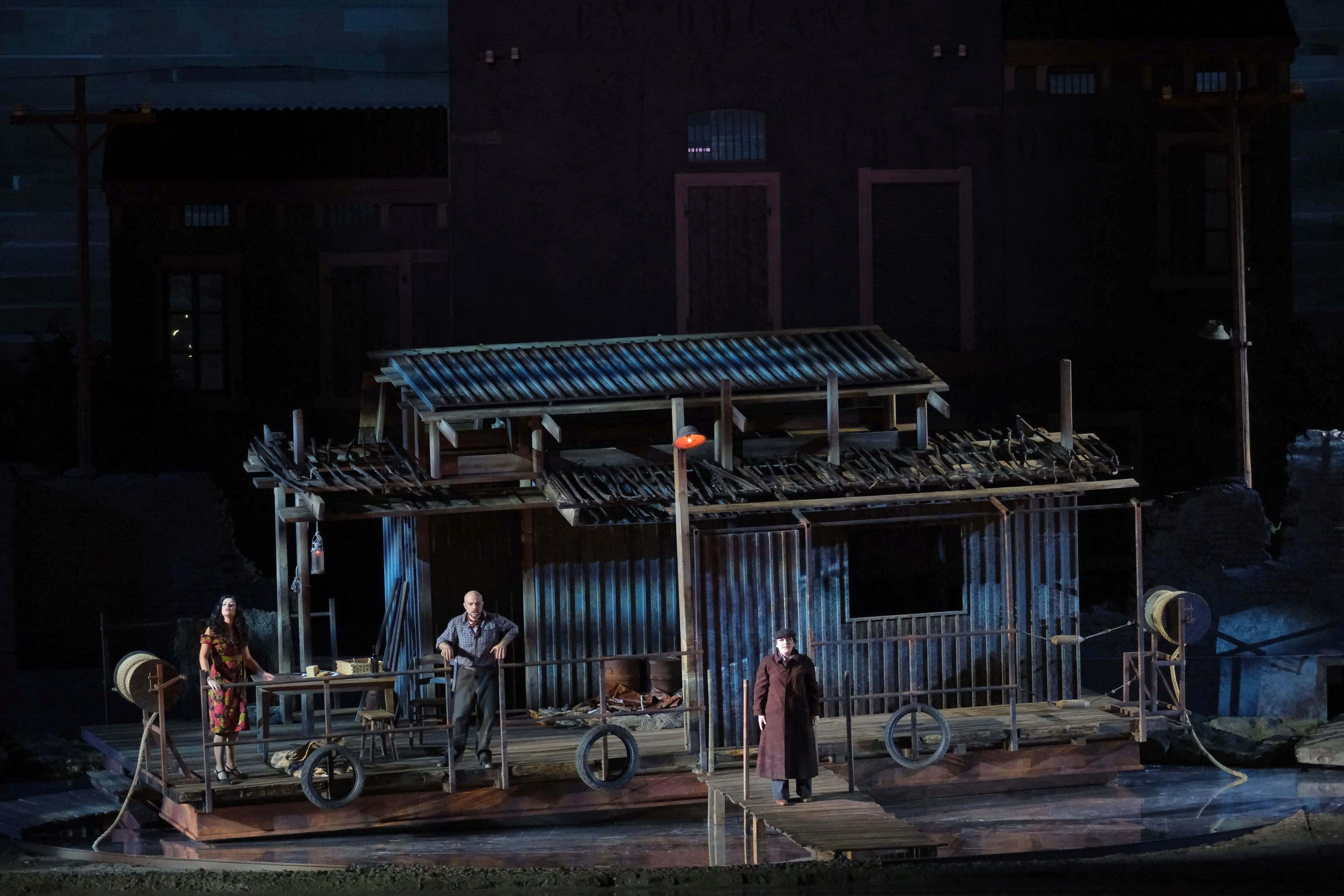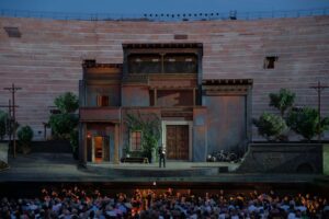 Tra gli 8 titoli d’opera del ricco 100° Festival c’è Rigoletto nel nuovo allestimento firmato dal regista Antonio Albanese con scene di Guillermo Nova, costumi di Valeria Bettella e luci di Paolo Mazzon, giunto alla sua ultima replica: lo spettacolo colloca la vicenda nella pianura padana degli anni ’50, tra i molti lavoratori e contadini al servizio del Duca, qui prepotente signorotto di provincia, in atmosfere notturne e misteriose che omaggiano la grande stagione del cinema neorealista italiano – e le terre dove nacque e visse lo steso Verdi.