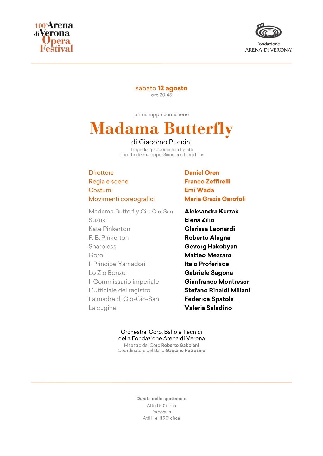 Il successo fu grande, grazie anche ai costumi del premio Oscar Emi Wada (1937-2021), ai movimenti coreografici di Maria Grazia Garofoli e al cast diretto dal maestro Daniel Oren che, a 19 anni da quella memorabile serata e dopo 4 riallestimenti del titolo, torna a guidare l’Orchestra di Fondazione Arena e il Coro istruito da Roberto Gabbiani. Proprio al coro tocca una delle pagine più celebri della storia dell’opera, quel brano “a bocca chiusa” che come una colonna sonora ante–litteram accompagna l’ultima veglia di Cio-Cio-San. Quanto all’orchestra, Puccini vi infuse la consueta maestria melodica, timbrica e armonica per creare il suo personale Giappone sonoro, raffinatissimo, multicolore, in linea con le avanguardie musicali dell’epoca ma sempre attento all’efficacia teatrale della sua opera.