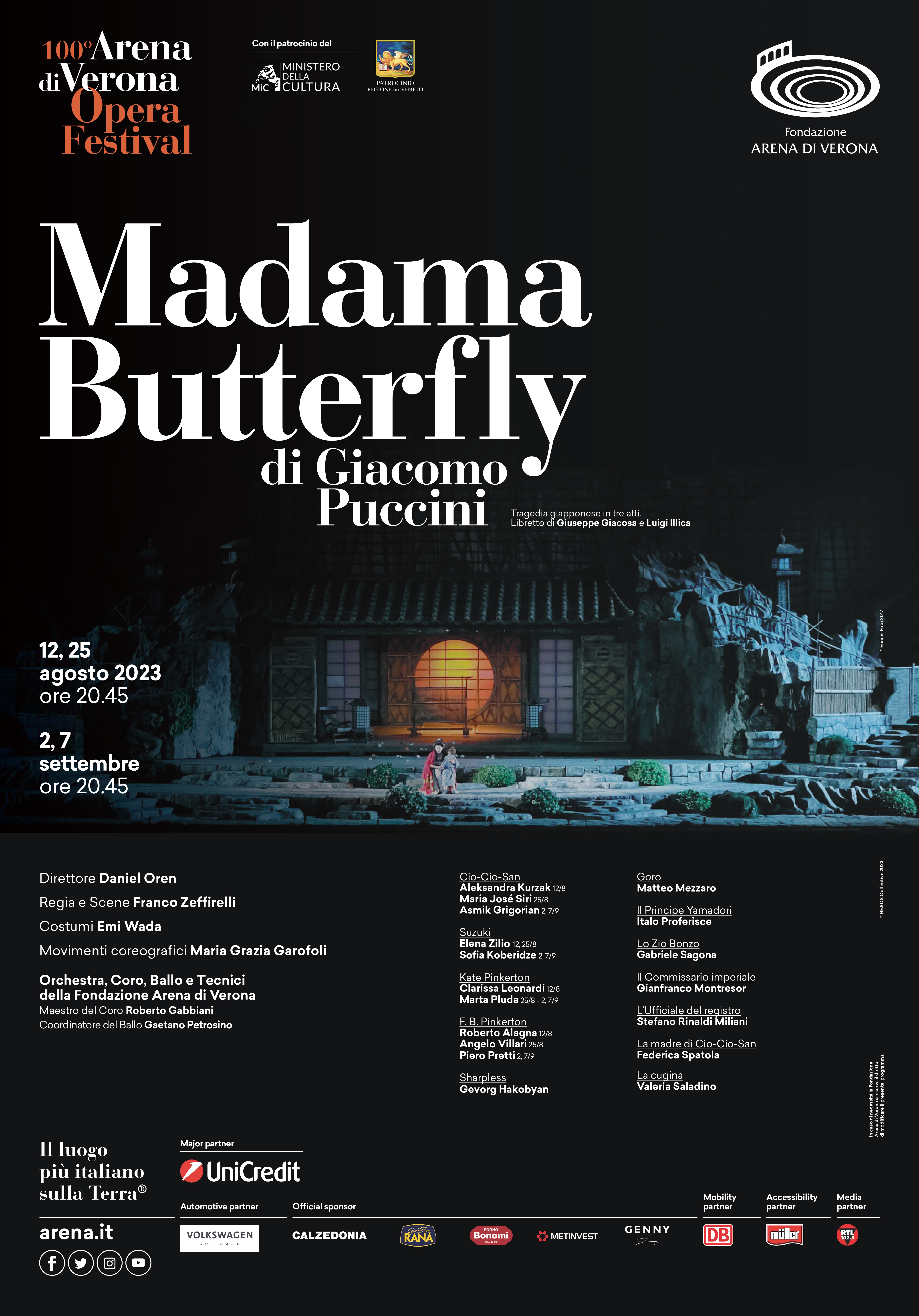 «Fondazione Arena si prepara da tempo al centenario pucciniano con un percorso che culminerà nel Festival 2024 appena annunciato – dichiara Cecilia Gasdia, Sovrintendente di Fondazione Arena. – Questa speciale Butterfly però non poteva mancare nel ricco programma del 100° Festival, come occasione speciale per vedere grandi artisti in scena e come omaggio a Franco Zeffirelli, nella sua unica produzione dedicata a questo capolavoro, nell’anno in cui avrebbe festeggiato il suo 100° compleanno».