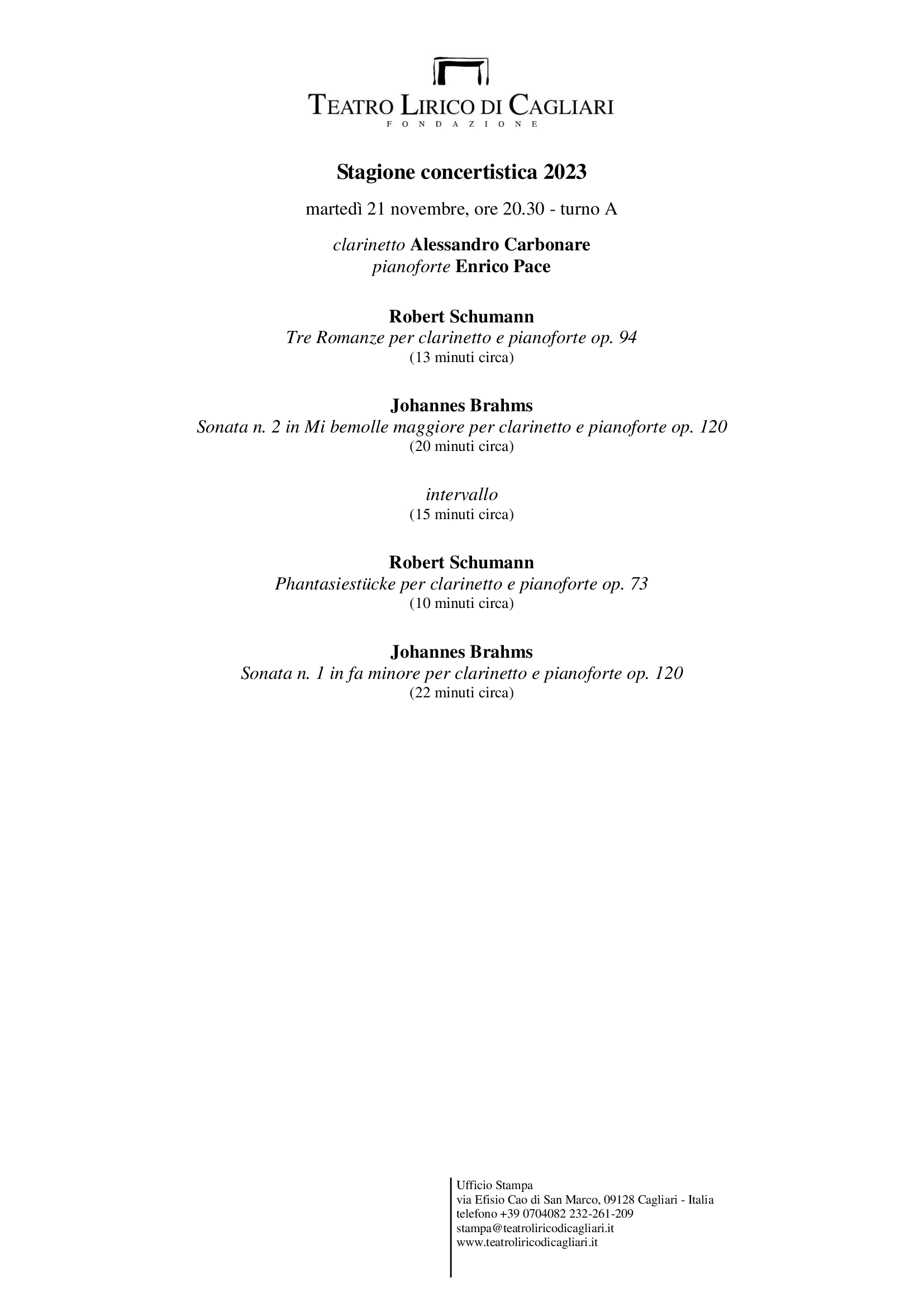 Martedì 21 novembre alle 20.30 (turno A) è in programma il diciottesimo e ultimo appuntamento della Stagione concertistica 2023 che prevede un altro, imperdibile recital di ottima musica da camera: si esibiscono Alessandro Carbonare (Desenzano del Garda, 1967), dal 2003 primo clarinetto dell’Orchestra dell’Accademia Nazionale di Santa Cecilia e che si è già esibito a Cagliari nel febbraio 2020 (poco prima del lockdown per la pandemia), ed Enrico Pace (Rimini, 1967), solido pianista dal curriculum internazionale, la cui ultima esibizione a Cagliari risale invece al novembre 2008.