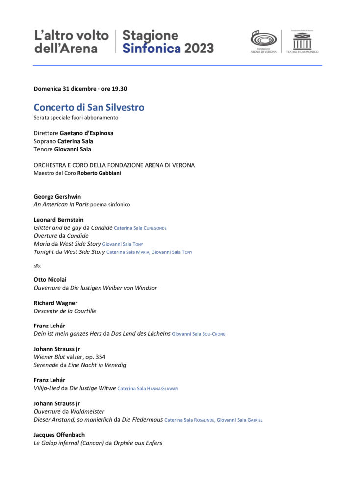 Se l’inizio del Concerto sarà dedicato alla musica più accattivante del Novecento americano (Un Americano a Parigi, Candide e West Side Story), nella seconda parte della serata si aggiungerà il Coro di Fondazione Arena, preparato dal maestro Roberto Gabbiani, che porterà sul palco, tra i giri di valzer della Vienna imperiale, le più belle pagine di opere e operette quali Il Pipistrello, La Vedova allegra, Orfeo all’inferno. Non mancheranno autentiche chicche inedite, come il coro scritto da Wagner per il carnevale parigino o l’omaggio a Shakespeare secondo Nicolai con Le Allegre comari di Windsor.