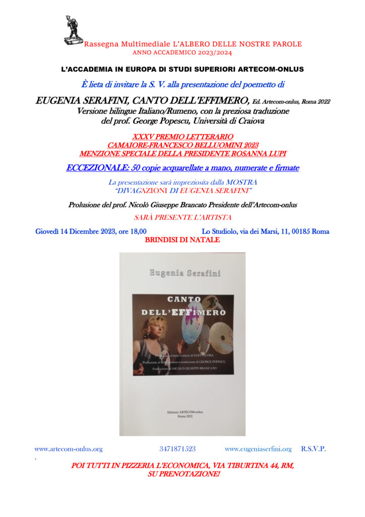 ROMA – Sarà presentato Giovedì 14 dicembre, alle ore 18, presso lo Studiolo dell’artista, in Via dei Marsi 11, il poemetto “Canto dell’Effimero” di Eugenia Serafini, Edizioni Artecom-onlus Roma 2022, in versione bilingue italiano/rumeno con la preziosa traduzione del prof. George Popescu dell’Università di Craiova. L’evento sarà aperto dal prof. Nicolò Giuseppe Brancato, Presidente dell’Artecom-onlus, Accademia in Europa di Studi Superiori, in un ambiente d’arte impreziosito dalla Mostra “Divagazioni formali” della poetessa e pittrice Eugenia Serafini. Per l’occasione saranno disponibili 50 copie del poemetto acquarellate a mano, numerate e firmate dall’Autrice.