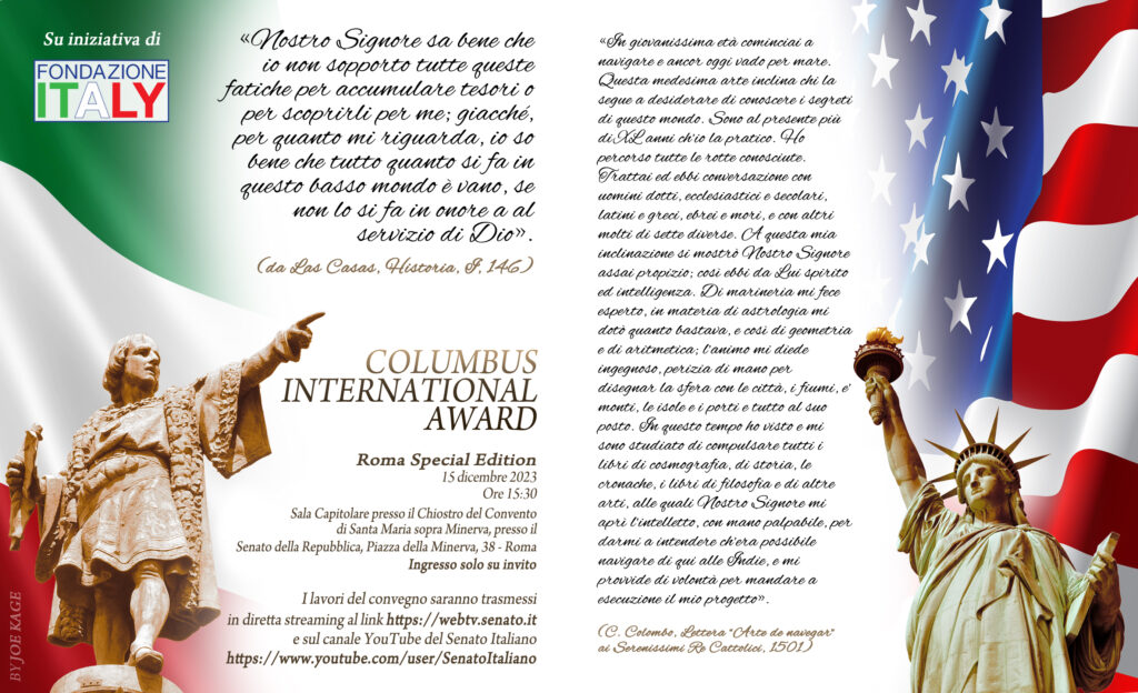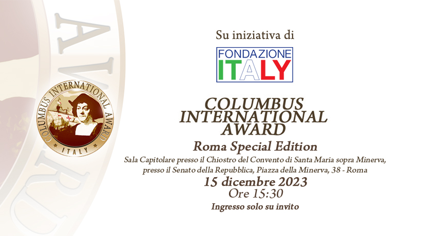 Al via la quarta edizione del COLUMBUS INTERNATIONAL AWARD, il premio dedicato a personalità, aziende ed associazioni che si sono distinte, ciascuno nel proprio campo, per aver diffuso e/o tutelato la cultura italiana e l’italianità. Il premio ideato, fondato e organizzato dal Presidente di Fondazione ITALY, Dott. Massimiliano Ferrara, avrà luogo il prossimo 15 dicembre, alle ore 15:30, in una sede di prestigio, intrisa d’arte, storia, cultura, un’eccellente sede per un COLUMBUS INTERNATIONAL AWARD che si preannuncia effervescente con importanti personalità in qualità di premiati e di ospiti. La sede scelta per questa IV edizione, denominata Roma Special Edition, è la Sala Capitolare del Senato della Repubblica presso il Chiostro del Convento di Santa Maria sopra Minerva, in Piazza della Minerva, 38 a Roma.