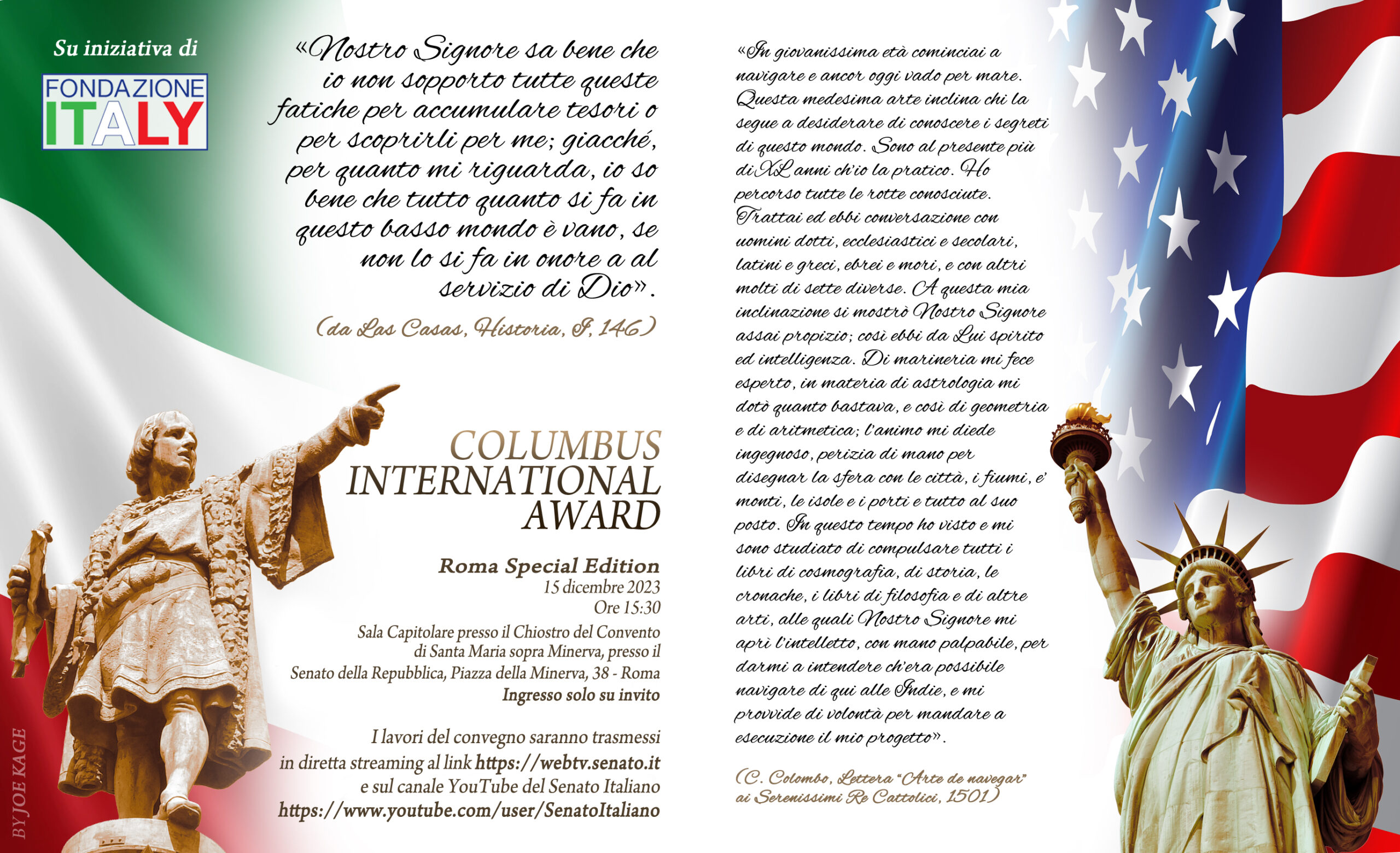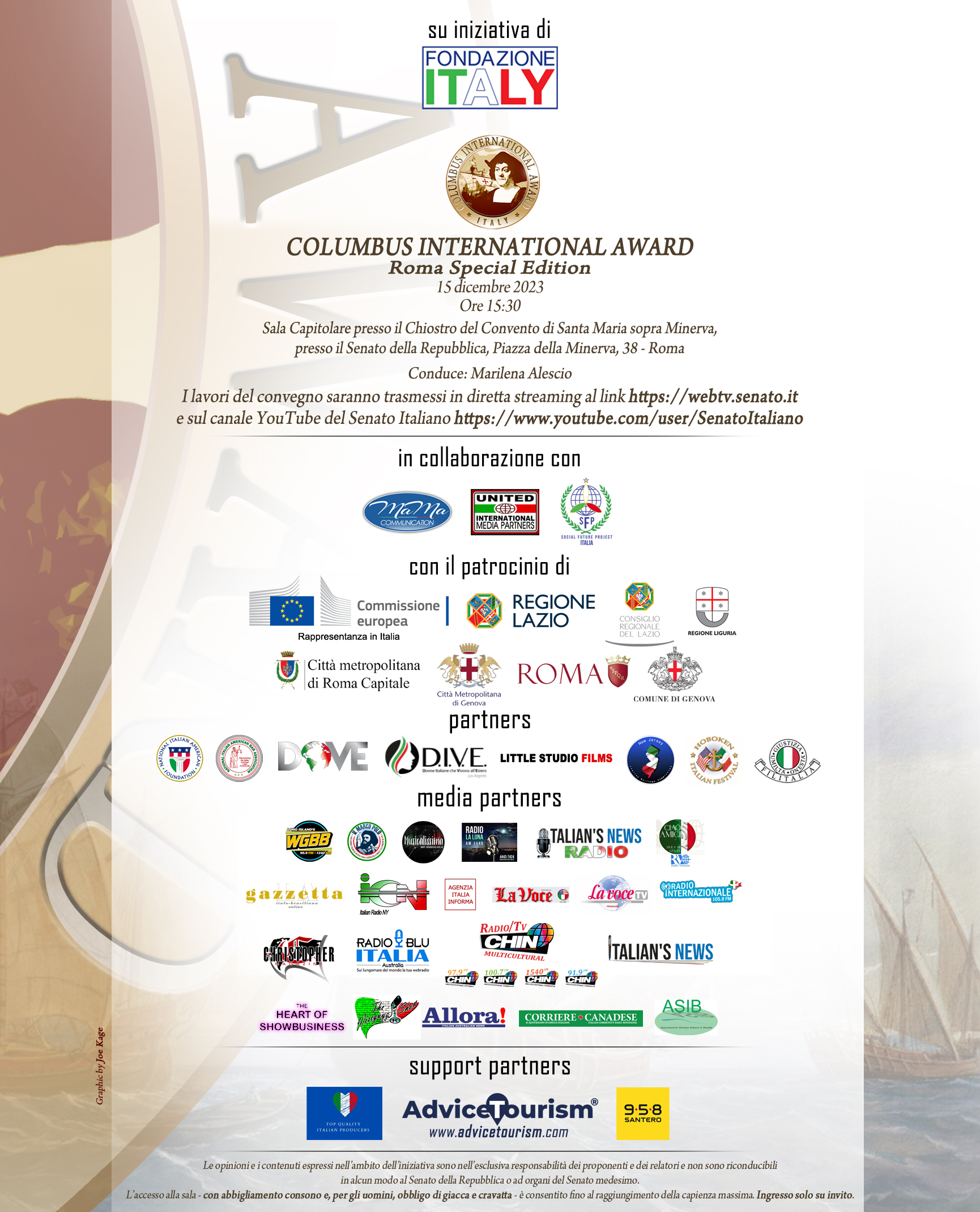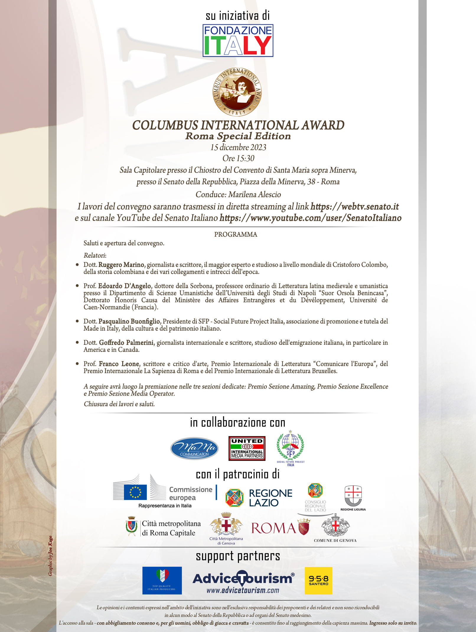Il COLUMBUS INTERNATIONAL AWARD sarà l’occasione per parlare dell’Italia, delle sue eccellenze, della nostra cultura, a 360°, della nostra unicità, del nostro talento e del bello che ci contraddistingue nel mondo. La conduzione di questa importante IV edizione è affidata alla giornalista Marilena Alescio. L’evento potrà essere seguito in diretta streaming direttamente sul sito del Senato della Repubblica (https://webtv.senato.it/webtv_live) e sul relativo canale YouTube (https://www.youtube.com/user/SenatoItaliano).