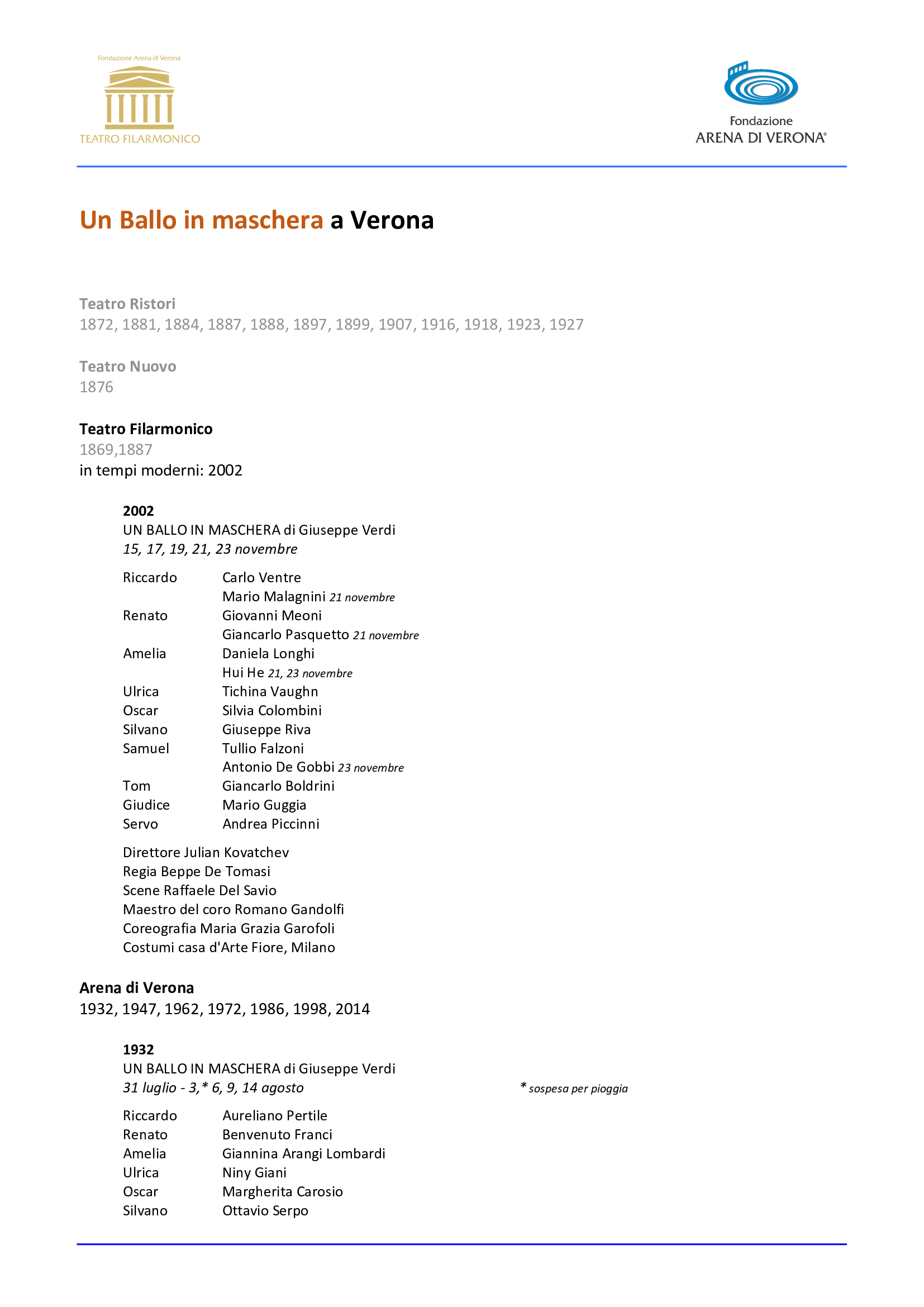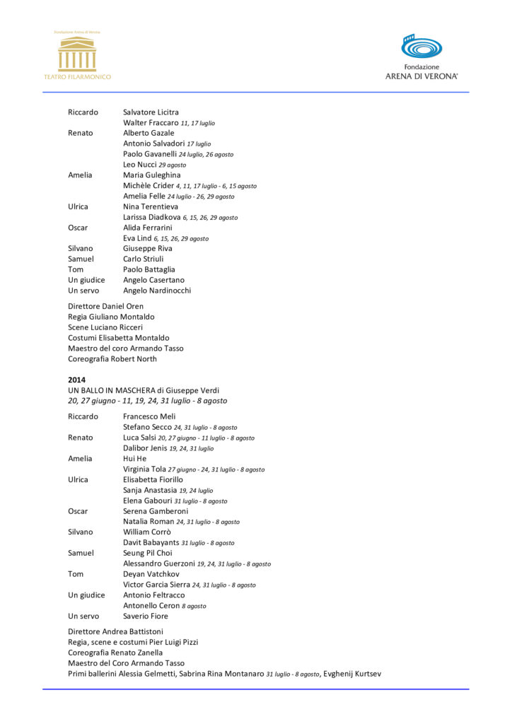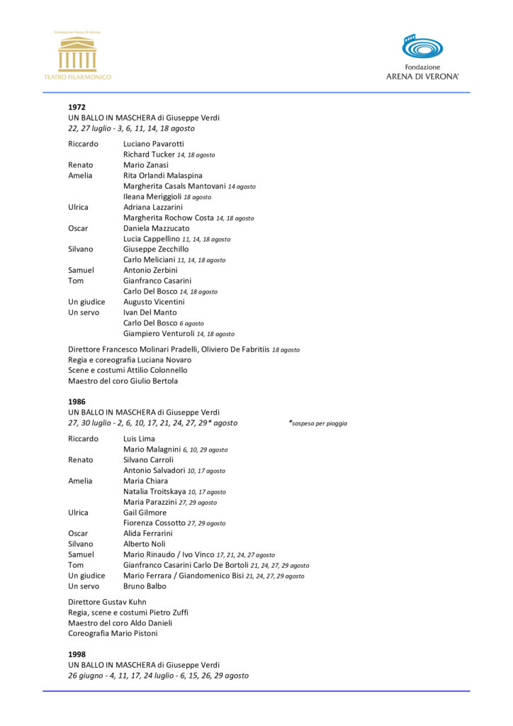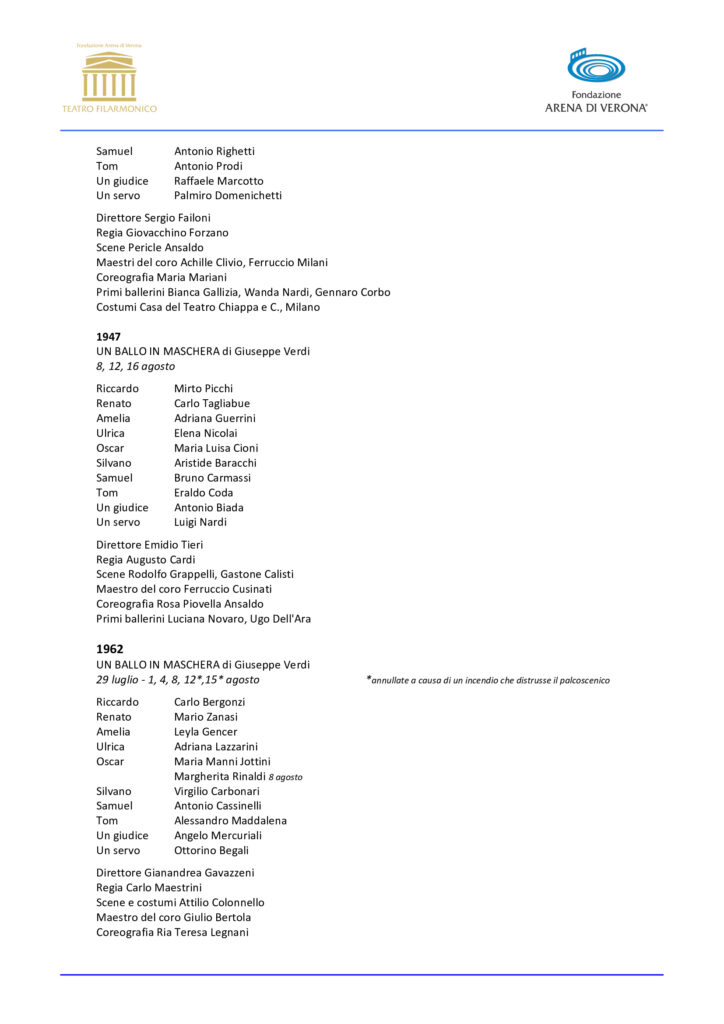 «Il Teatro Filarmonico, ‘l’altro volto dell’Arena’, propone i capolavori del repertorio lirico e sinfonico meno frequenti o inediti in Anfiteatro – dichiara Cecilia Gasdia, Sovrintendente di Fondazione Arena – e Un Ballo in maschera, che dopo lunga assenza conclude questa Stagione Lirica, è un capolavoro che merita di essere riscoperto con la massima cura possibile su questo palcoscenico. Lo spettacolo che vedremo è un omaggio allo stile di messinscena con cui è nata l’Opera, e la compagnia comprende alcuni dei migliori artisti di oggi nel panorama internazionale, con attenzione ai giovani di talento. Varietà e qualità della proposta artistica ci hanno guidati anche nella Stagione 2024, già disponibile, piena di sorprese, novità e artisti di rilievo».