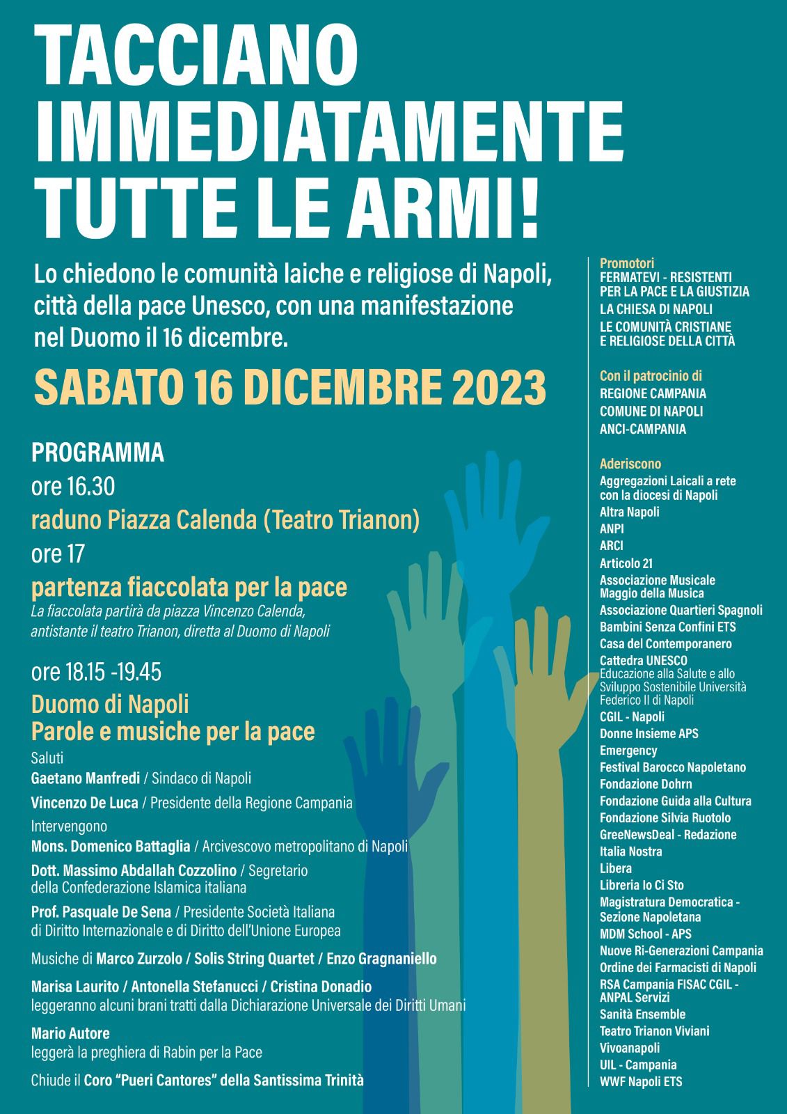 Una partecipazione corale che prenderà il via con una fiaccolata di bambini che partirà dallo storico teatro Trianon per raccogliersi nell’antichissima cattedrale di Santa Maria dell’Assunzione, che aprirà le sue porte in nome della pace, Parleranno Mons. Domenico Battaglia, arcivescovo di Napoli, il Dott. Massimo Abdallah Cozzolino, Segretario della Confederazione Islamica Italiana, il Prof. Pasquale De Sena, Presidente della Società Italiana di Diritto Internazionale e di Diritto dell’Unione Europea. Il sindaco di Napoli Gaetano Manfredi e il Presidente della Regione Campania Vincenzo De Luca porteranno i saluti istituzionali.