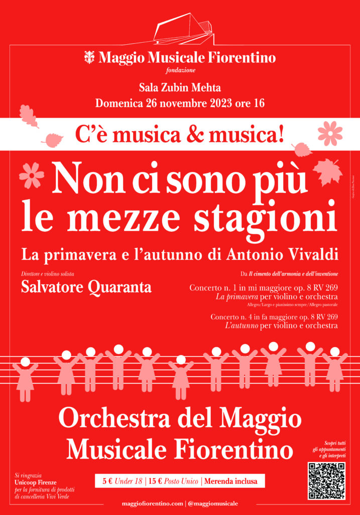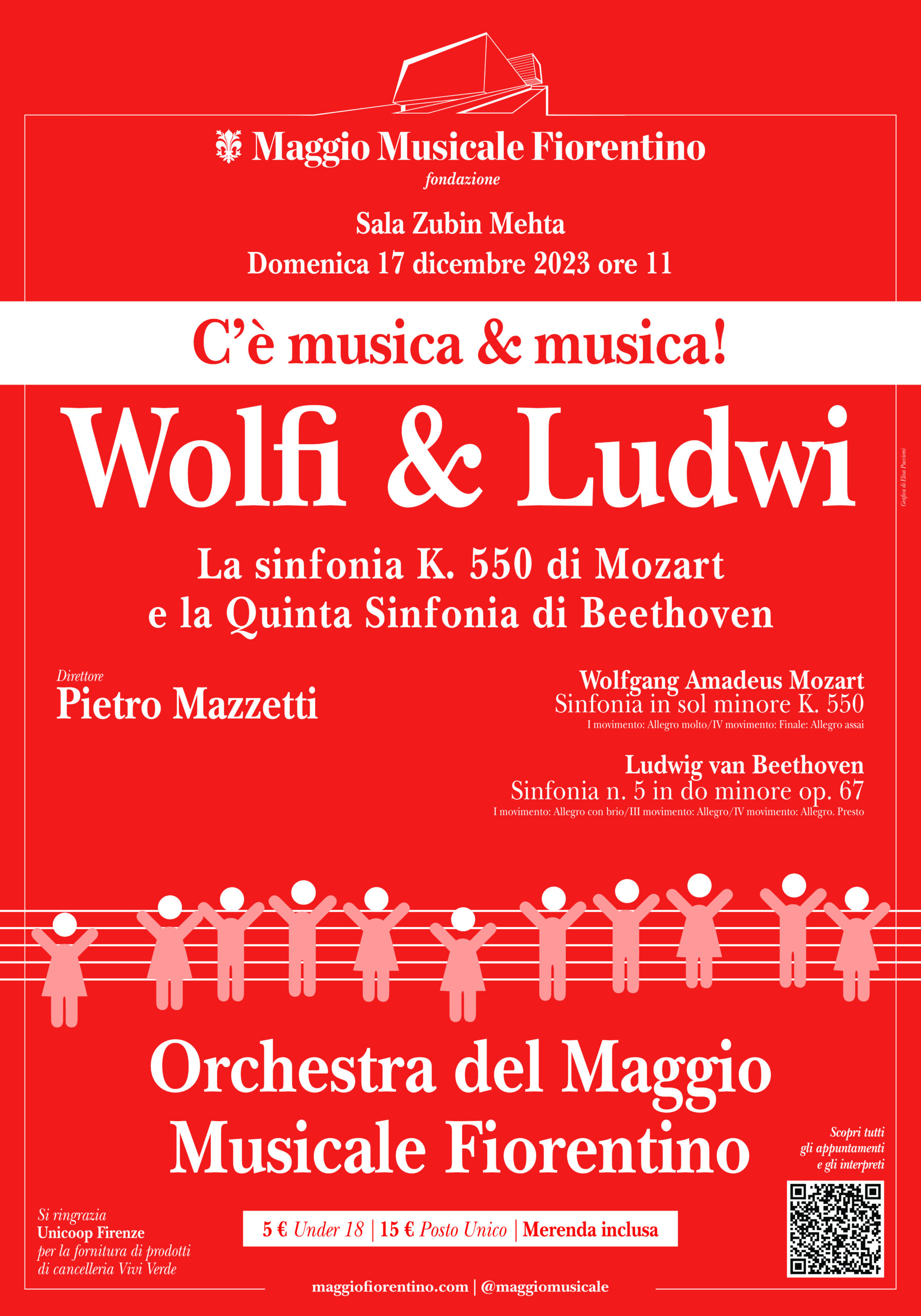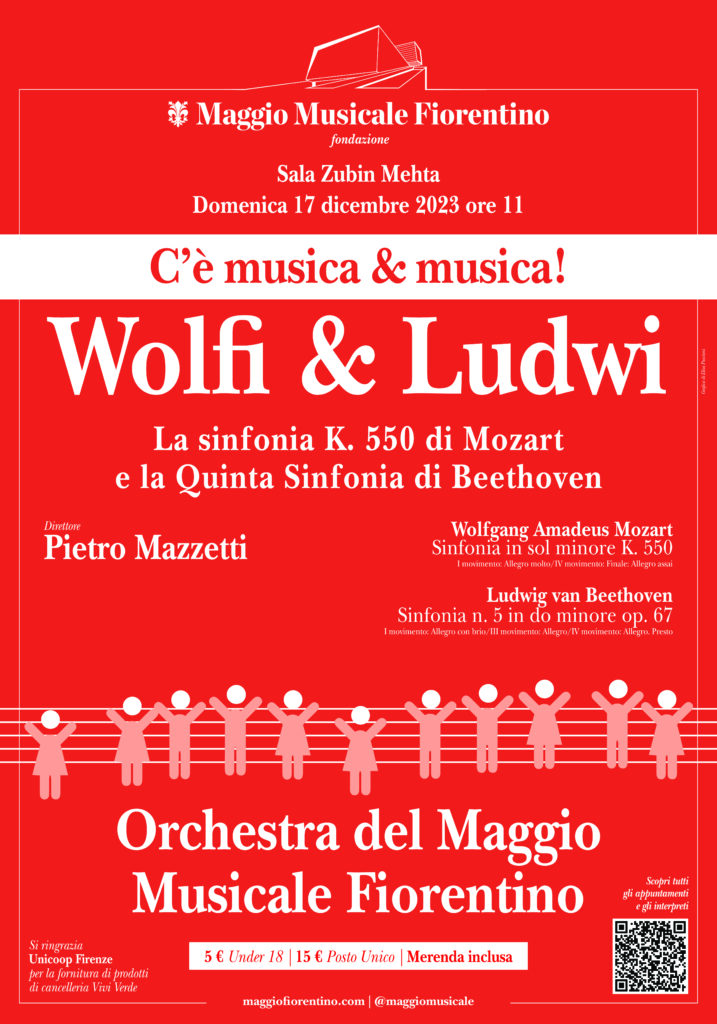 Firenze, 15 dicembre 2023 – Si chiude per quest’anno, con lo spettacolo in programma domenica 17 dicembre alle ore 11, sempre in Sala Zubin Mehta, Wolfi&Ludwi: la sinfonia K550 di Mozart e la Quinta di Beethoven, il frizzante e brioso Ciclo C’è Musica & Musica, che per otto domeniche (più una, con la richiestissima replica di Pierino e il lupo) ha accompagnato i tanti, tantissimi giovani che insieme alle famiglie hanno riempito la Sala Mehta e il Teatro, animando le mattinate domenicali al Maggio dal 1° ottobre sino a oggi.