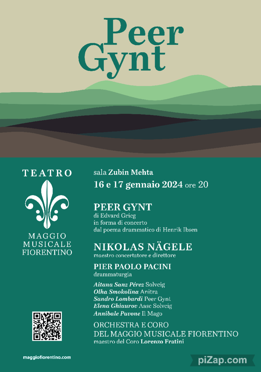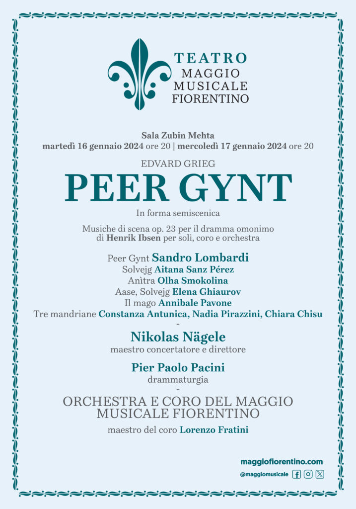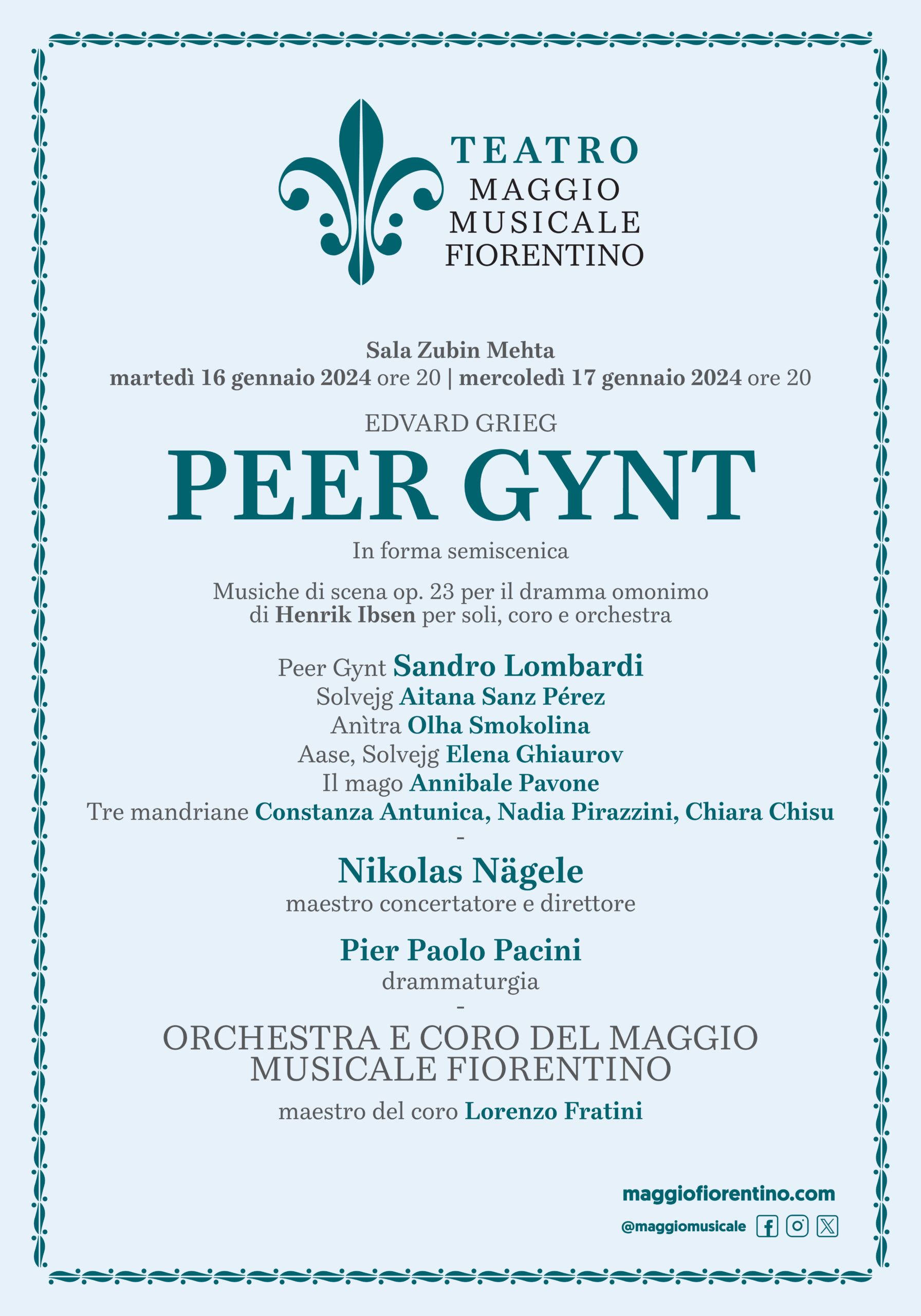 A distanza di oltre vent’anni, torna nella programmazione del Maggio, il 16 e il 17 gennaio 2024 alle ore 20, in Sala Mehta, “Peer Gynt”, musiche di scena di Edvard Grieg per il dramma di Henrik Ibsen. L’opera, che dà ufficialmente il via alla stagione invernale del Maggio, è proposta in forma di concerto.