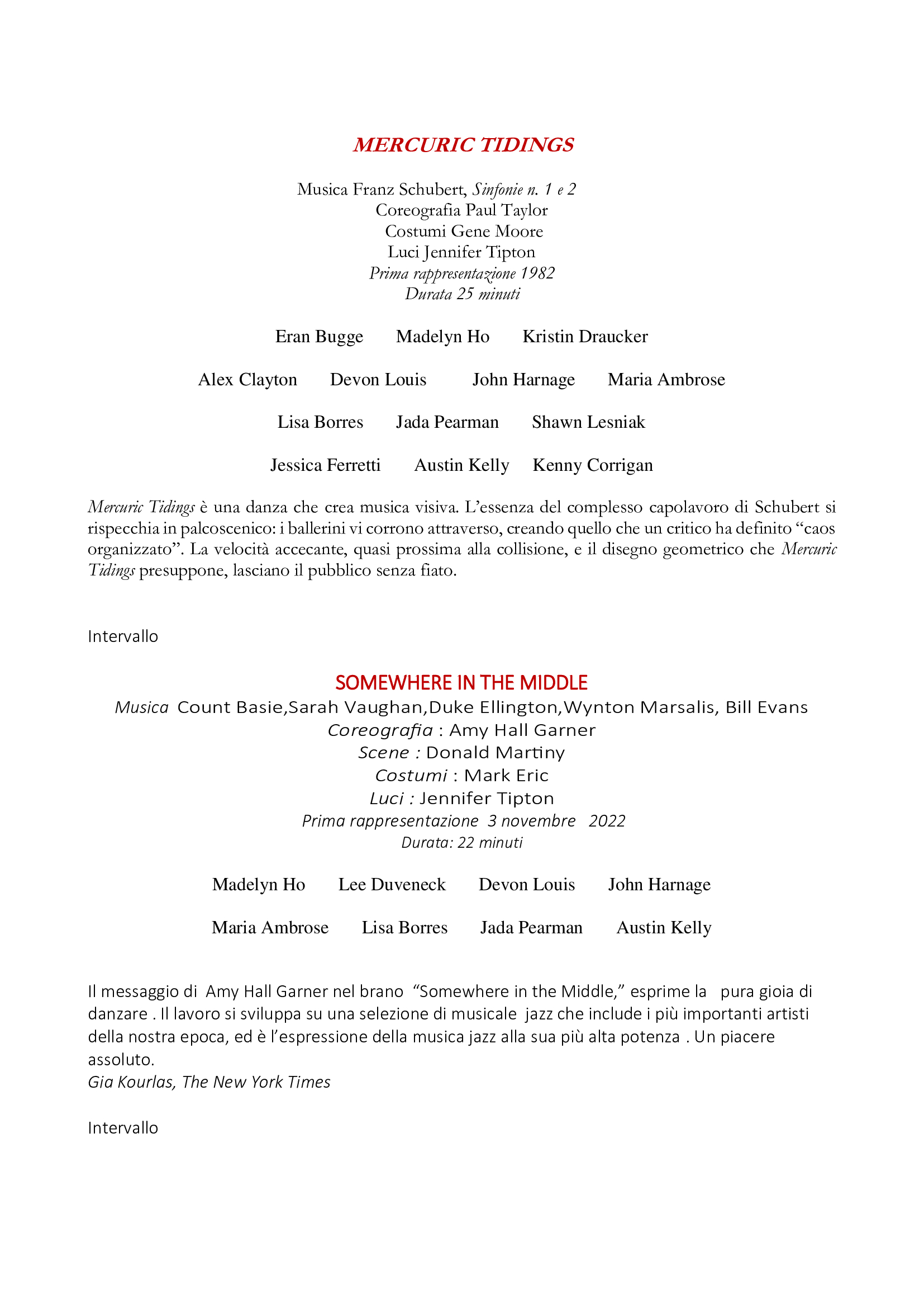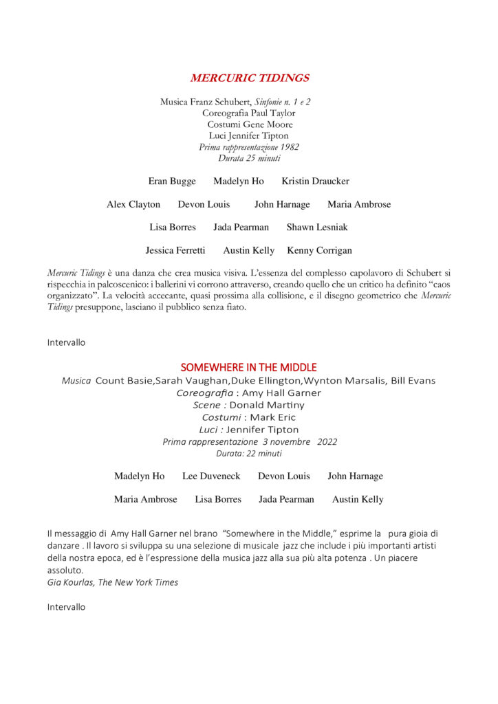 Mercuric Tidings, creazione del 1982 di Paul Taylor, con i costumi di Gene Moore e le luci di Jennifer Tipton, riporta la complessità delle Sinfonie di Franz Schubert in un disegno geometrico, che i tredici danzatori attraversano dando l’idea di un caos organizzato, in una velocità sempre più accecante, al limite della collisione. Una vera e propria musica visiva.