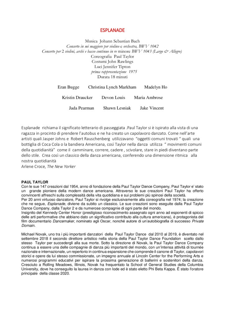 La quotidianità diventa danza in Esplanade(letteralmente “passeggiata”), coreografia di Paul Taylor del 1975 divenuta un classico della danza moderna. Ispirato dalla vista di una ragazza in procinto di prendere l’autobus, il coreografo, trasforma in danza movimenti comuni come camminare, correre, cadere, scivolare, stare in piedi, per conferire, sulle musiche di Johann Sebastian Bach (il Concerto per violino in Mi maggiore e il Concerto per due violini in Re minore), una dimensione ritmica al nostro vivere quotidiano.