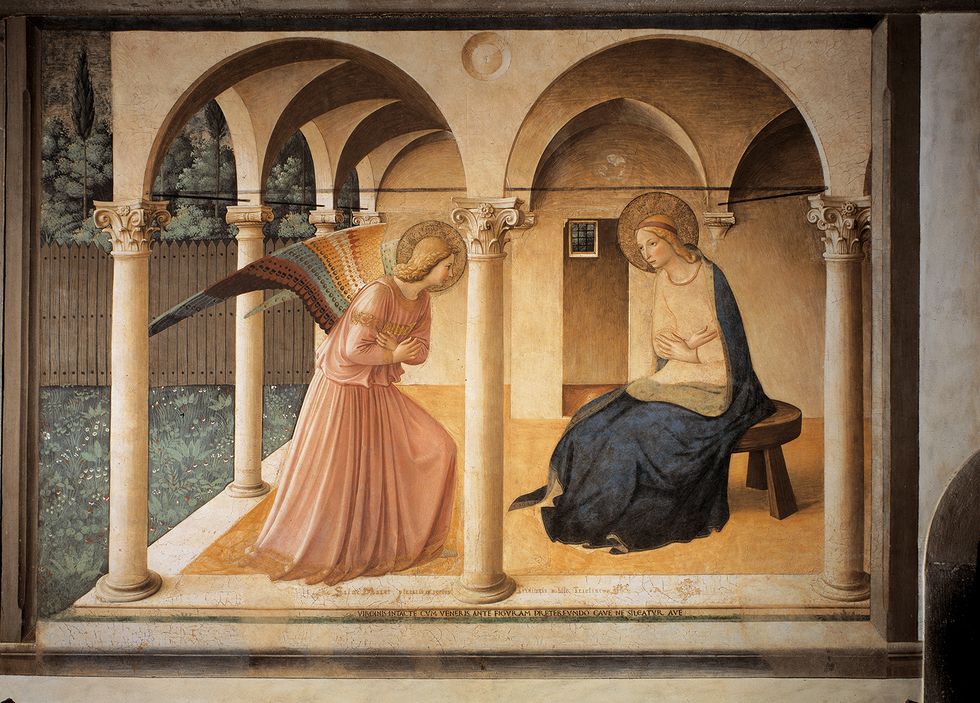 Veo la Virgen María en una de tus Anunciaciones y es un ser etéreo de una materia más cercana a los ángeles que a los humanos. Una mirada humilde se concentra en la aparición de un ángel que trae un mensaje y que te dice en una voz que no sale de boca alguna que el Señor está con ella y que dentro de su vientre se ha anidado la esperanza de toda la humanidad. La escena es irreal pero divina y me lleva a un mundo extraño en donde el ambiente, casi teatral, parecen ser contemporáneo a tu existencia, fraile. Los ropajes son medievales y la Virgen y Gabriel están en un recinto que parece una loggia similar a la que podemos ver en las cercanías de Santa Maria Novella, la Piazza della Signoria o frente al Palazzo Rucellai, en Florencia.