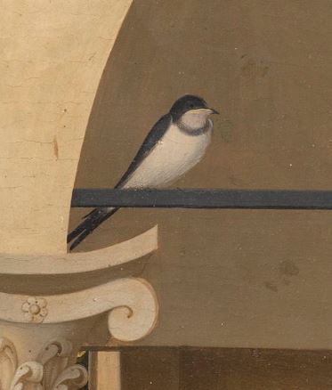 Dime Golondrina que es lo que estás haciendo en esa pintura en una entrometida aparición que parece no tener relación alguna con el silencioso diálogo entre María y el Arcángel. ¿Eres una única golondrina o la representación de todos los hirundínidos del mundo?