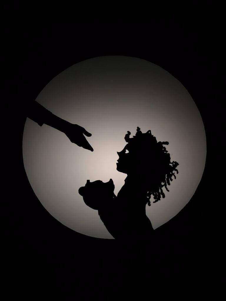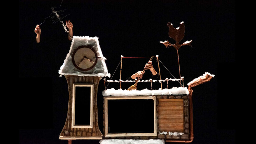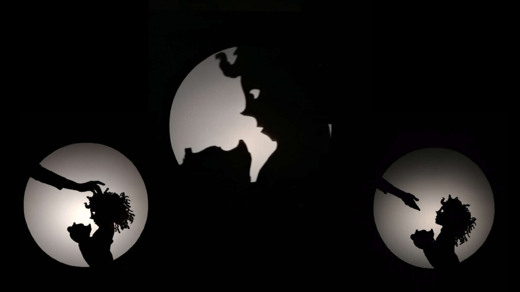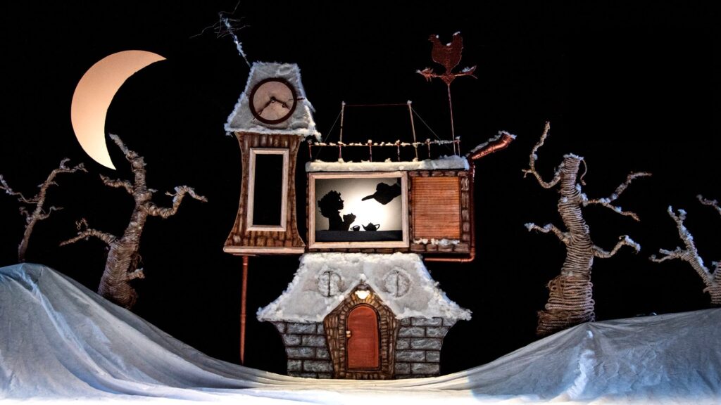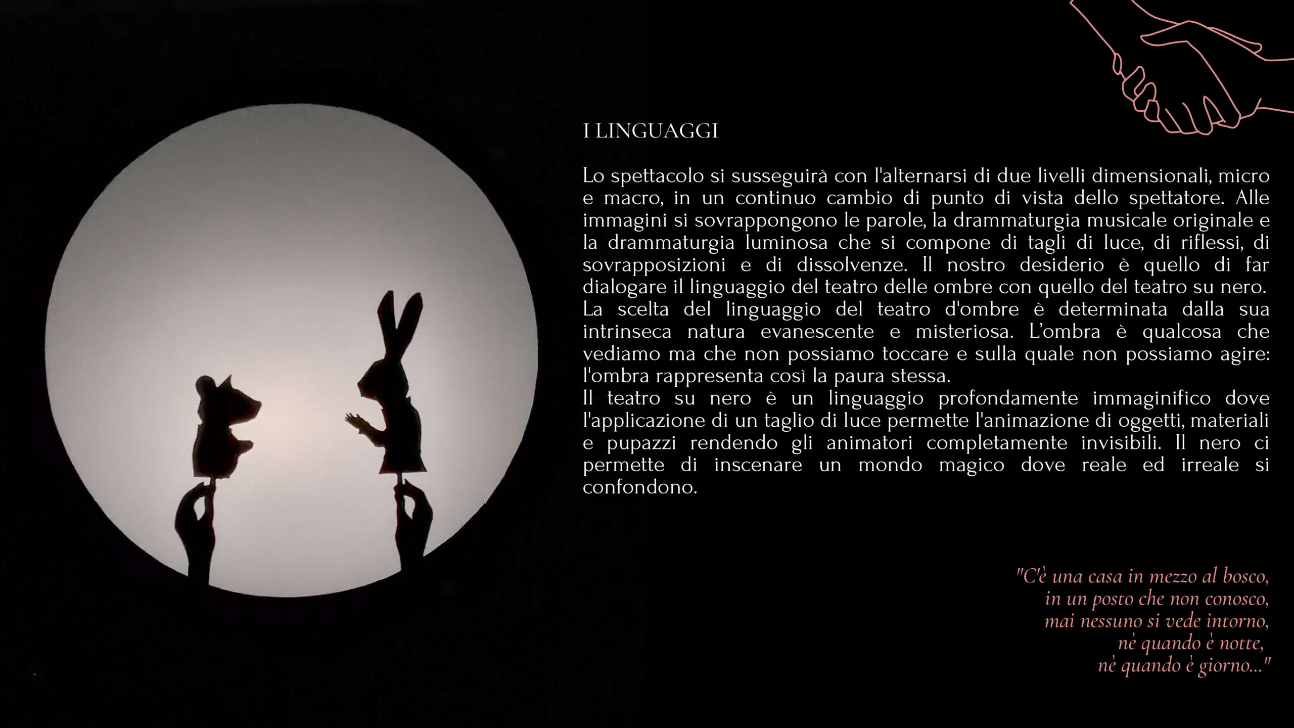 In un continuo alternarsi di tagli di luce, riflessi, sovrapposizioni e dissolvenze, lo spettacolo mescola il linguaggio del teatro delle ombre con quello del teatro su nero per creare un doppio livello visivo, un doppio punto di vista. “L’ombra – si legge nelle note di regia, è qualcosa che vediamo che non possiamo toccare e sulla quale non possiamo agire: essa rappresenta così la paura stessa. Il teatro su nero è un linguaggio profondamente immaginifico dove l’applicazione di un taglio di luce permette l’animazione di oggetti, materiali e pupazzi rendendo gli animatori completamente invisibili. Il nero ci permette di inscenare un mondo magico dove reale ed irreale si confondono”.