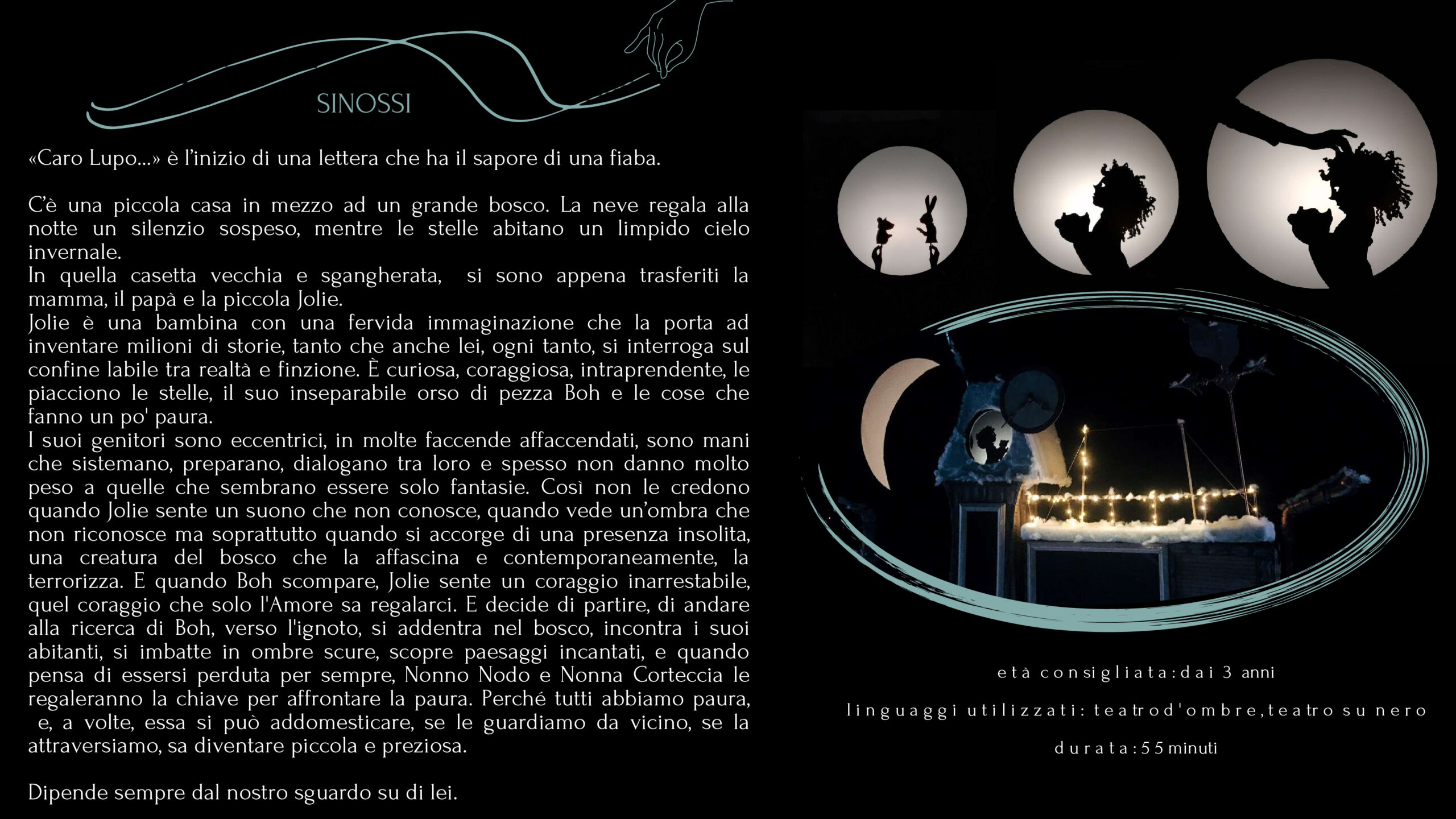 In scena, i puppets animati dalle voci di Aurora Aramo, Arianna Aramo, Miriam Costamagna, Andrea Lopez Nunes, Nadia Milani, Giacomo Occhi, saranno i protagonisti di una storia che ha inizio da una lettera: quella della piccola Jolie, bambina curiosa e intraprendente che vive in una piccola casa in mezzo ad un grande bosco con la mamma e il papà. Un giorno il suo inseparabile orso di pezza Boh scompare e Jolie è mossa da grande coraggio che la spinge a inoltrarsi nel bosco alla ricerca del suo amico, sfidando le sue paure.