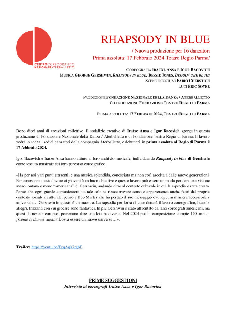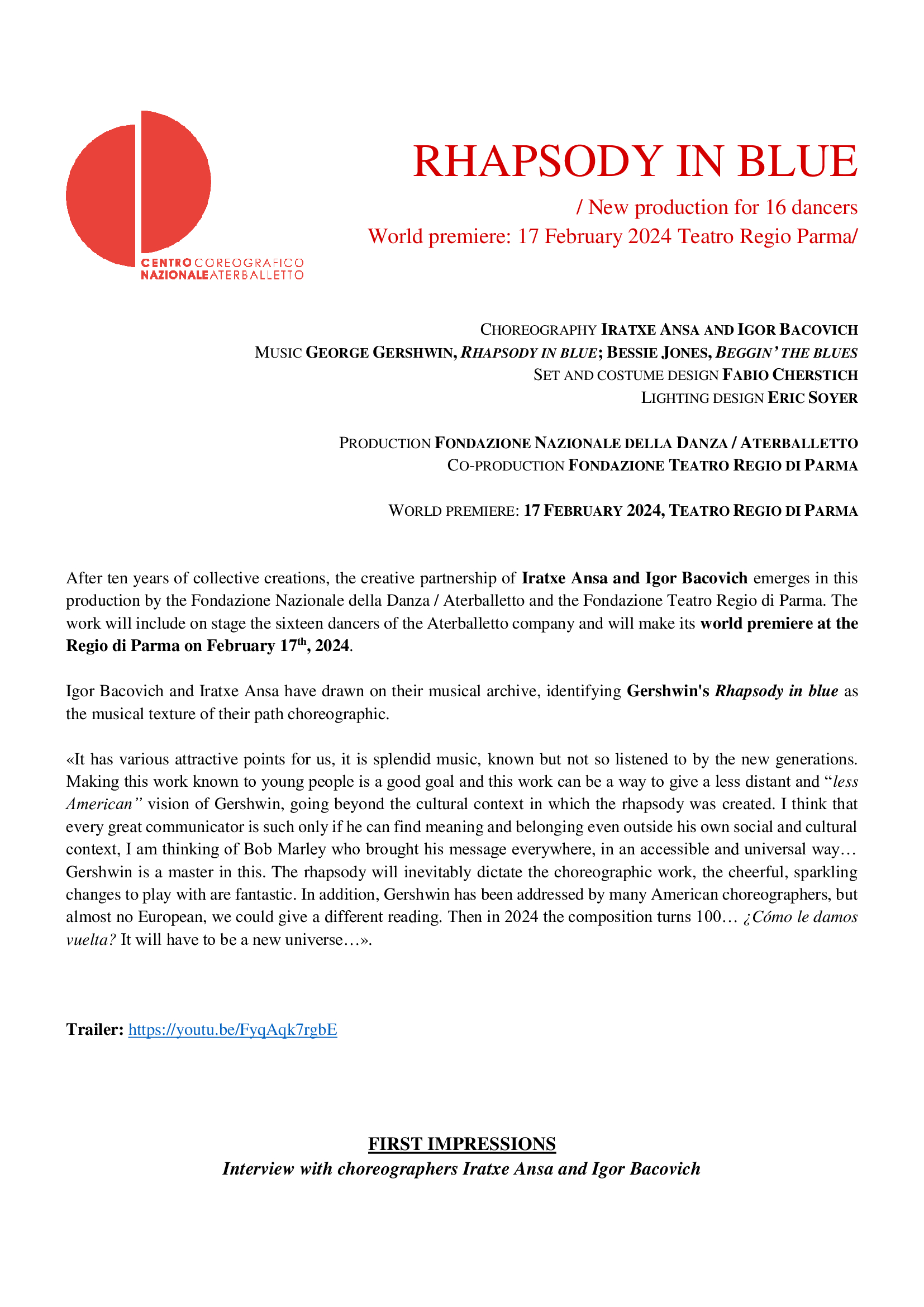 Per ParmaDanza 2024 il CCN/Aterballetto porta in scena al Teatro Regio di Parma sabato 17 febbraio 2024, ore 20.30, un trittico di creazioni, tra cui la prima assoluta di Rhapsody in Blue, nuova produzione inedita firmata da Iratxe Ansa e Igor Bacovich, in coproduzione con Teatro Regio di Parma. In scena anche Yeled di Eyal Dadon (2022) e Secus (2019), di Ohad Naharin.