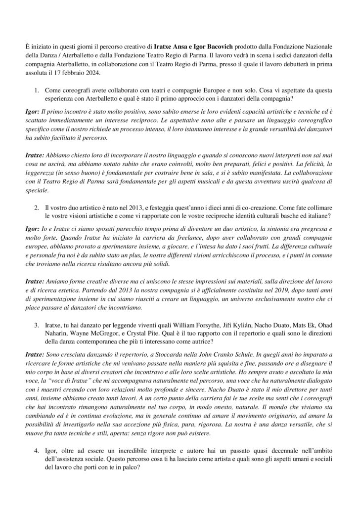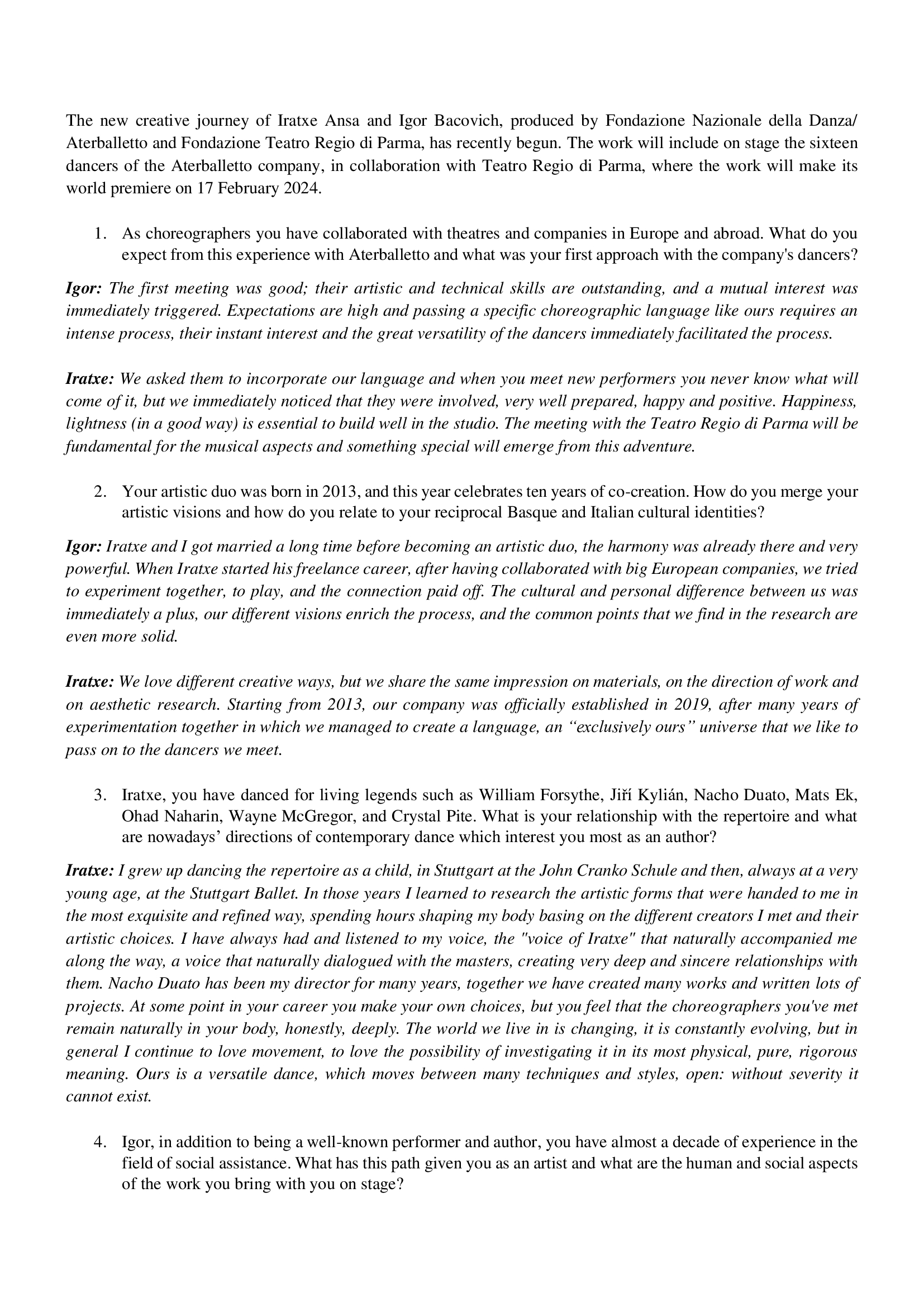 Per quanto riguarda l’approccio a quest’opera così connotata, abbiamo ovviamente sentito il bisogno di sfuggire ad ogni stereotipo. L’estetica è dunque contemporanea e minimalista – grazie al visual di Fabio Cherstich – e la coreografia segue liberamente la grande capacità di plasmare una danza fluida e potente che segna la cifra stilistica di Iratxe Ansa e Igor Bacovich. Un pezzo destinato per questo ad accompagnarci nei prossimi anni nelle tournée sempre più internazionali che caratterizzano il Centro Coreografico Aterballetto.”