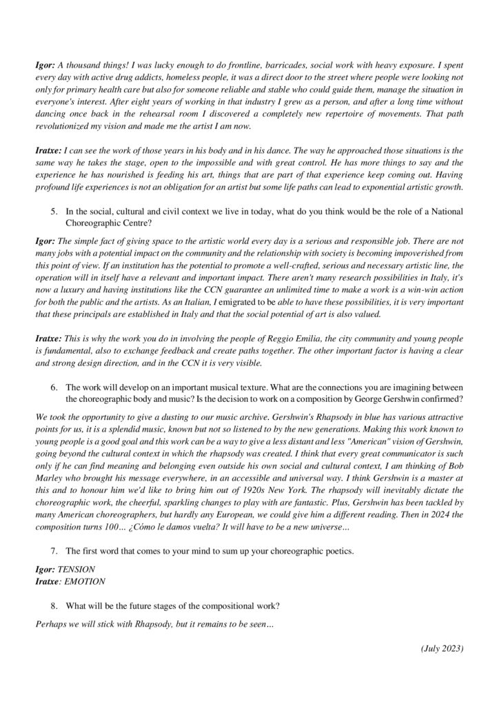 “L’idea iniziale di questo lavoro – raccontano i coreografi, era di giocare con la rapsodia di Gershwin, poterla riscrivere attraverso un altro immaginario. In Rhapsody in blue la cosa interessante non è solo portare il nostro sguardo, fatto della nostra esperienza, del confronto internazionale e dello stile maturato negli anni, ma soprattutto regalare al pubblico una visione più universale, meno legata al contesto newyorkese o allo spirito di quell’epoca. Abbiamo cercato di trasportare, di rivedere Gershwin a livello storico, cercando di de-contestualizzarlo per potenziare ancora di più l’universalità del suo capolavoro. Chiudere gli occhi, sentire cosa vuole dirci quella musica, e rappresentarla attraverso l’oggi, attraverso la nostra poetica, esprimerla con il nostro approccio al movimento e al corpo scenico”.