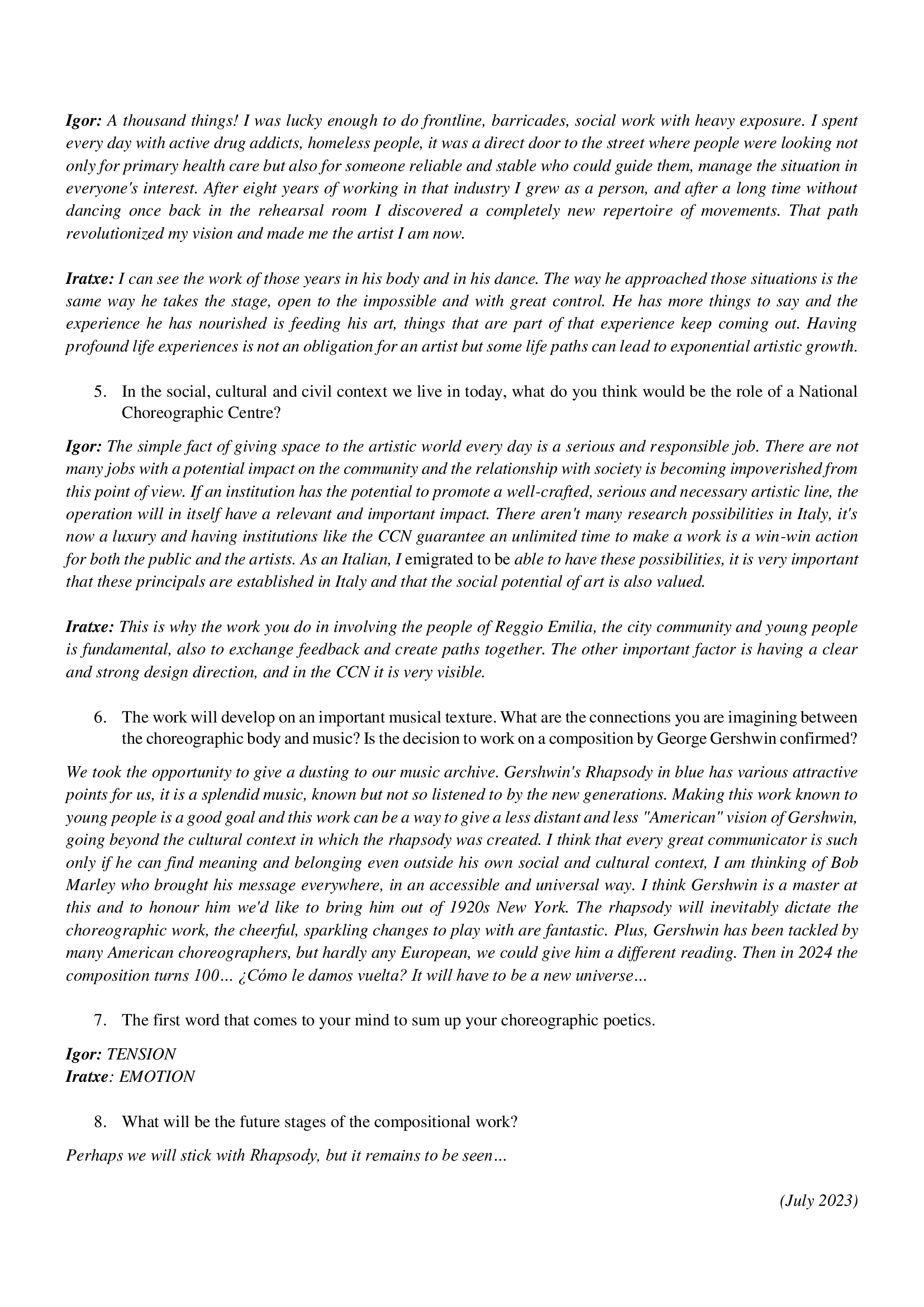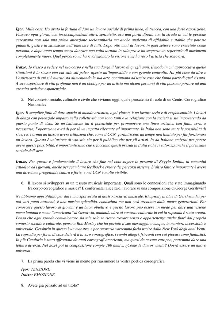 e delle luci di Eric Soyer, vuole trovare nuove modalità per dare una visione meno lontana e meno “americana” di Gershwin, andando oltre al contesto culturale in cui la rapsodia è stata creata. È la rapsodia stessa a dettare la trama del lavoro coreografico, i cambi energici, le modulazioni elettriche con cui giocare.