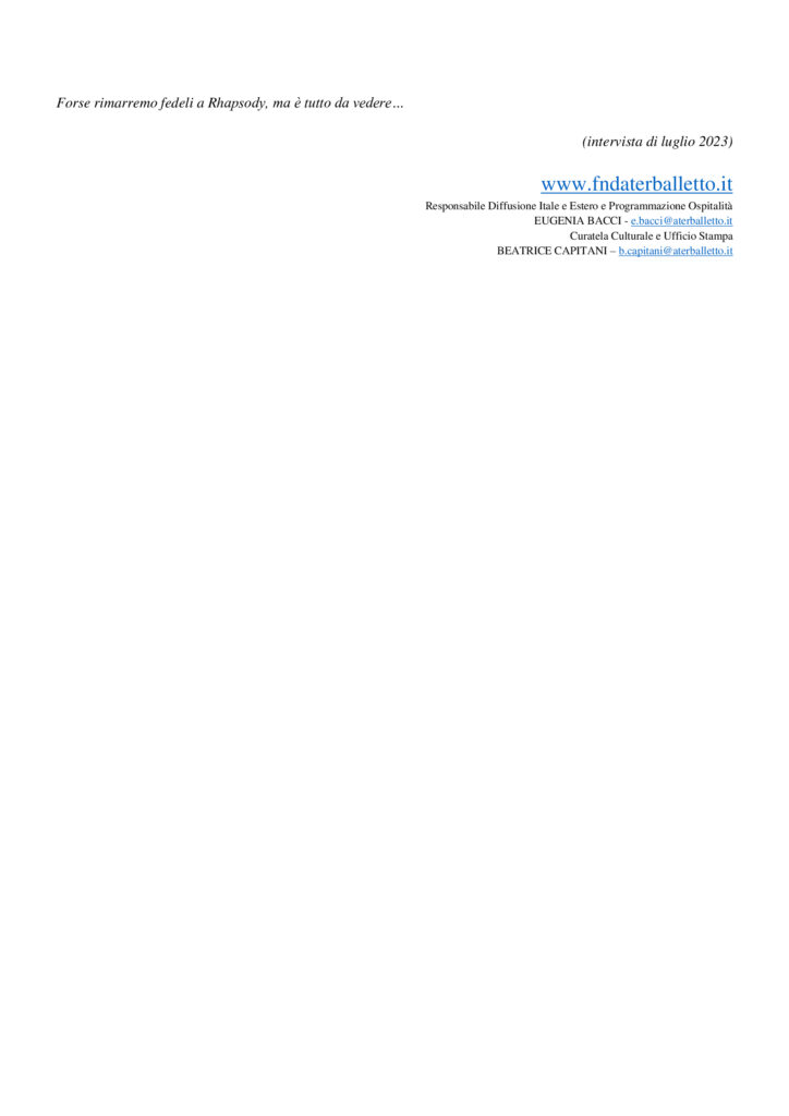 “Iniziando una collaborazione con il Teatro Regio di Parma, proprio in coincidenza con l’avvio del progetto di sviluppo e rilancio che il Sovrintendente Messi sta portando avanti, ci siamo chiesti insieme quale fosse la direzione di lavoro migliore. Ed è venuto spontaneo pensare di orientarci su un pezzo musicale di valore emblematico. Rhapsody in blue è uno di quei rari brani che sono diventati un baricentro estetico, e perfino emotivo, della propria epoca e del proprio Paese. E dalla creazione del capolavoro di George Gershwin sono passati esattamente cent’anni. Eccoci, quindi, a sottolineare ancora una volta quanto sia importante collaborare tra discipline differenti, portando avanti una visione più contemporanea della creazione artistica.