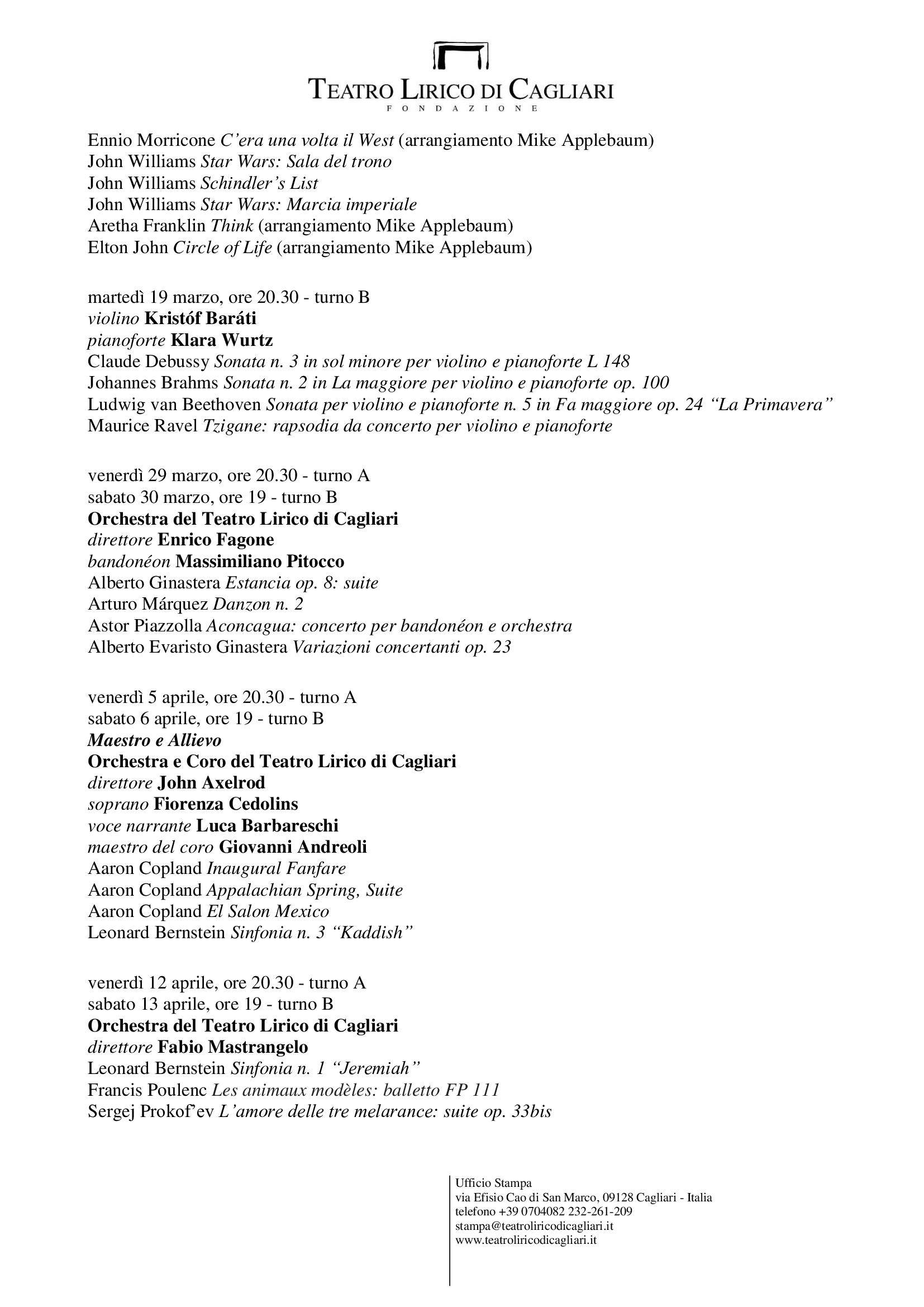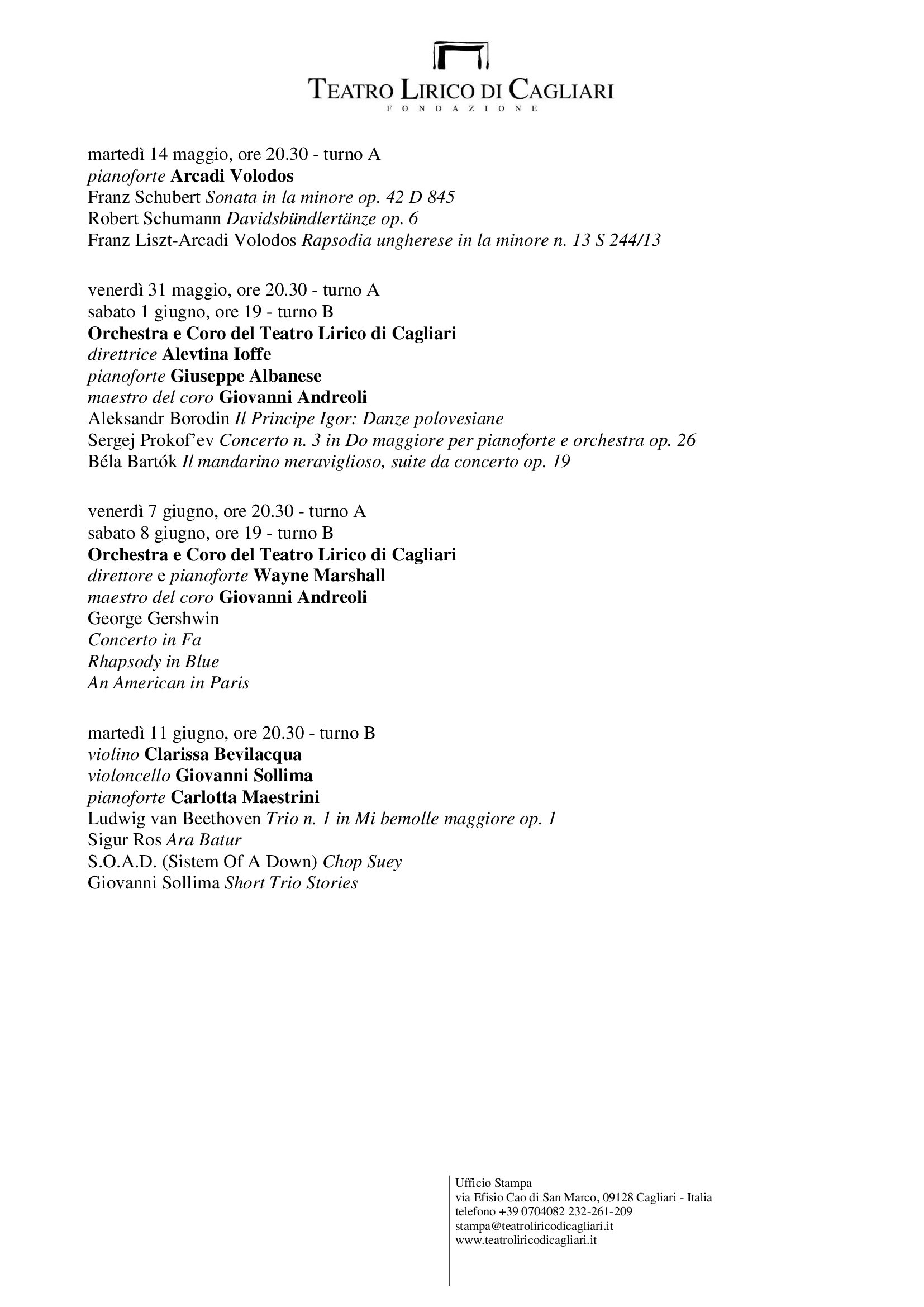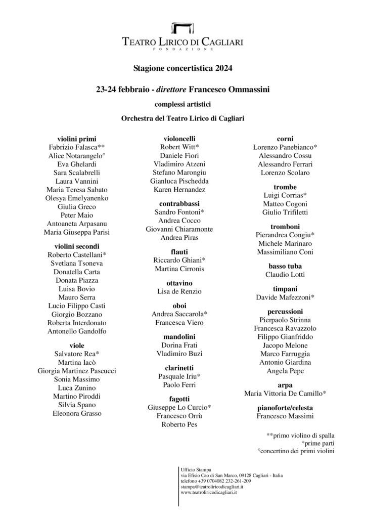 Teatro Lirico di Cagliari, via Efisio Cao di San Marco, 09128 Cagliari – Italia telefono +39 0704082209 – stampa@teatroliricodicagliari.it – www.teatroliricodicagliari.it