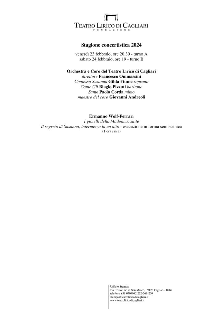 Venerdì 23 febbraio alle 20.30 (turno A) e sabato 24 febbraio alle 19 (turno B) è in programma il terzo appuntamento della Stagione concertistica 2024 del Teatro Lirico di Cagliari che prevede uno stimolante e insolito concerto sinfonico-corale interamente dedicato a Ermanno Wolf-Ferrari, nell’esibizione dell’Orchestra e del Coro del Teatro Lirico, guidati da Francesco Ommassini, giovane direttore veneziano, specialista del repertorio del primo Ottocento che ritorna a Cagliari dopo il suo debutto nell’ottobre 2016 con La pietra del paragone di Rossini e, in seguito, con Don Pasquale di Donizetti nel maggio 2021. I ruoli solistici sono affidati al soprano Gilda Fiume (Contessa Susanna), al baritono Biagio Pizzuti (Conte Gil) e al mimo cagliaritanoPaolo Corda (Sante). Il maestro del coro è Giovanni Andreoli.