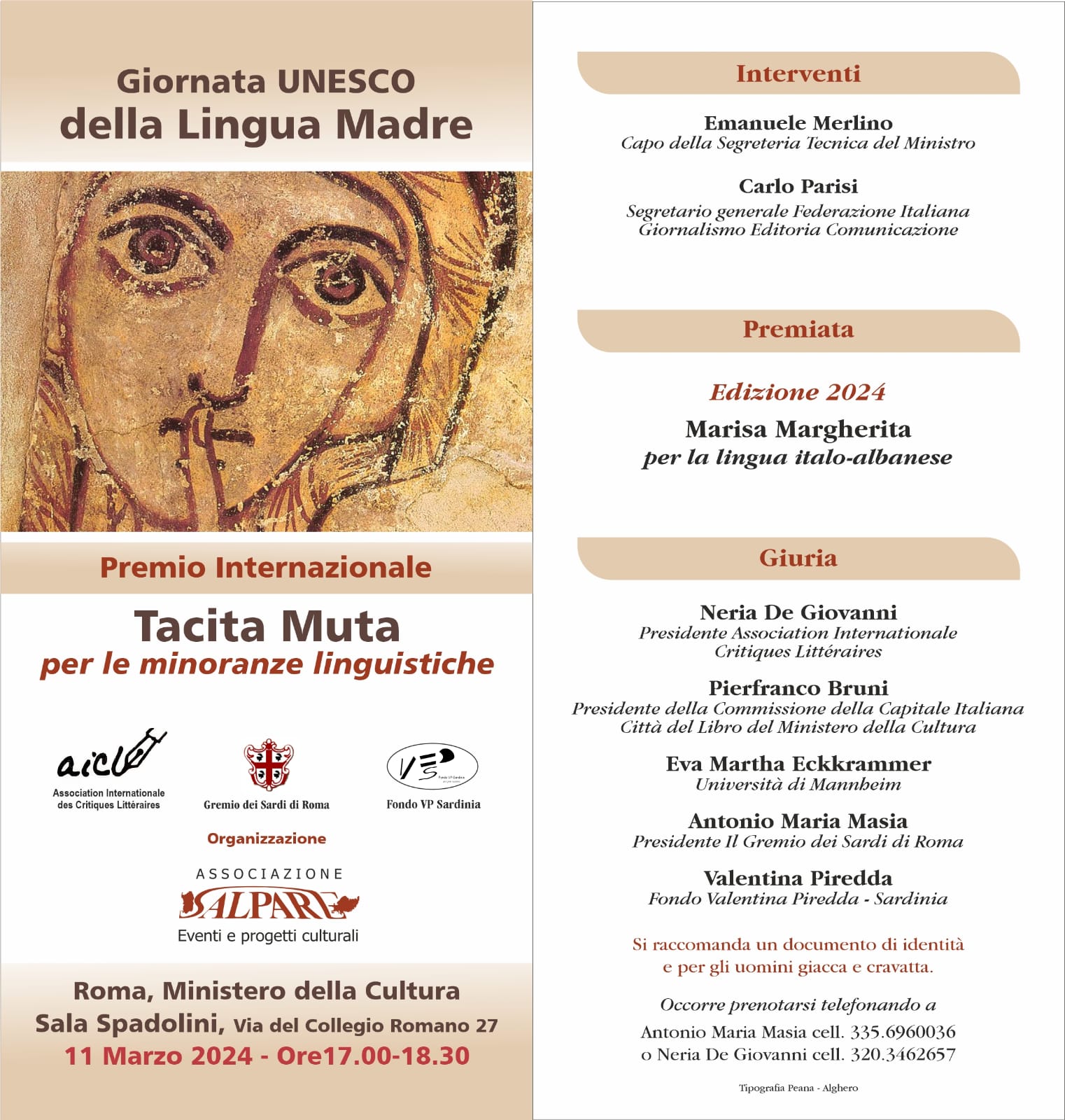 Un evento eccezionale al Ministero della Cultura lunedì 11 marzo con inizio alle ore 17,00. Verrà consegnata la sesta edizione del premio Tacita Muta per le minoranze linguistiche, quest’anno assegnato a Marisa Margherita di San Marzano di San Giuseppe (TA) “ per i suoi studi innovativi e le pubblicazioni sulla cultura e sulla lingua italo-albanese nel significato della tutela e valorizzazione dell’etnia”.