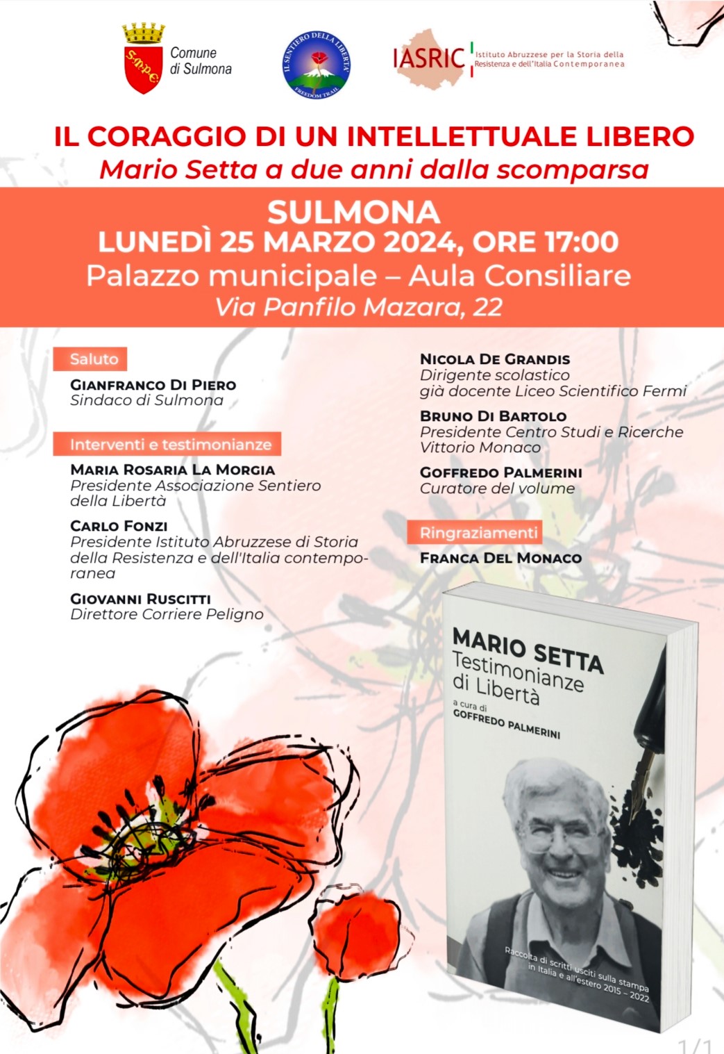 A due anni esatti dalla scomparsa, il 25 marzo 2024 alle ore 17, nell’Aula consiliare del Comune di Sulmona sarà ricordato lo storico Mario Setta in un evento intitolato “Il coraggio di un intellettuale libero”. All’incontro commemorativo, che sarà aperto dal saluto e dall’intervento del Sindaco Gianfranco Di Piero, parteciperanno con le loro testimonianze Maria Rosaria La Morgia – Presidente dell’Associazione Il Sentiero della Libertà, Carlo Fonzi – Presidente dell’IASRIC, Giovanni Ruscitti – direttore del Corriere Peligno, Nicola De Grandis – dirigente scolastico, Bruno Di Bartolo – Presidente del Centro Studi Vittorio Monaco, Goffredo Palmerini – giornalista e scrittore, e Franca Del Monaco, compagna di vita che con Mario Setta ha condiviso gli anni dell’impegno civile. Nel corso dell’evento sarà anche presentato il volume “Mario Setta, testimonianze di Libertà” (Edizioni Etabeta), una significativa raccolta di scritti e articoli di Setta, curata da Goffredo Palmerini, usciti sulla stampa in Italia e sulle testate italiane all’estero, dal 2015 al 2022.