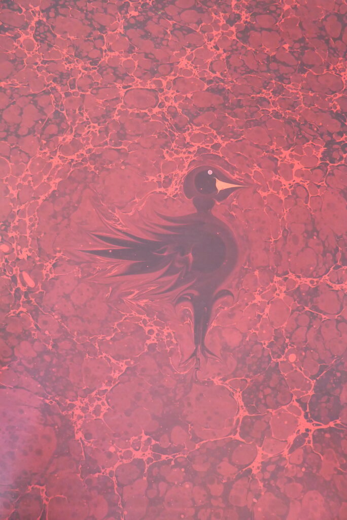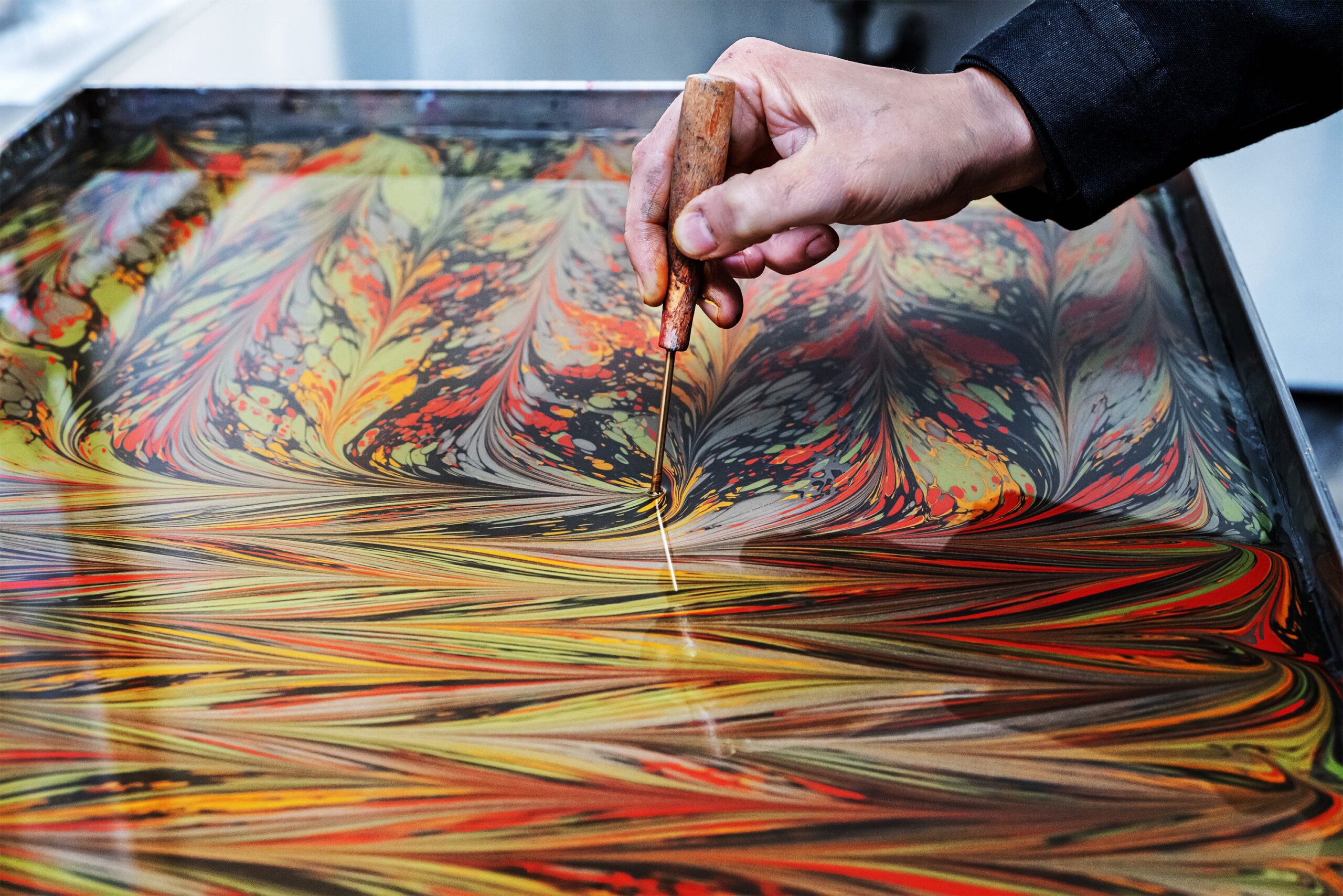 Alberto Valese, nato a Venezia nel 1951, si è dedicato per più di quarant’anni alla legatoria ed in particolare allo studio della tecnica della marmorizzazione che inizia da autodidatta, dando vita ad una serie di opere uniche nel loro genere che lo hanno reso noto in tutto il mondo. L’esposizione riesce ad essere, oltre che un omaggio al maestro veneziano attraverso una selezione ad ampio spettro fra le tipologie di carte da lui prodotte, anche un’occasione per far comprendere, attraverso dei supporti video, il modus operandi di Valese ed il suo immaginario. Carte marmorizzate, suminagashi, ebrù, sono tutte tecniche che convogliano nella realizzazione delle decorazioni, dal floreale all’astratto, di libri pregiati, quaderni, scatole, tessuti e oggetti di ogni tipo. In mostra si possono trovare non solo carte marmorizzate ed ebrù, ma anche vere e proprie opere d’arte come le pietre “non infossibili”, finti fossili realizzati fondendo l’ebrù con la modellazione della carta pesta, le piastre oscillanti che assomigliano a piccoli universi in miniatura sospesi da delicate strutture di ferro, i mobile, d’ispirazione calderiana, e ancora sculture a forma di teste ed oggetti di design.