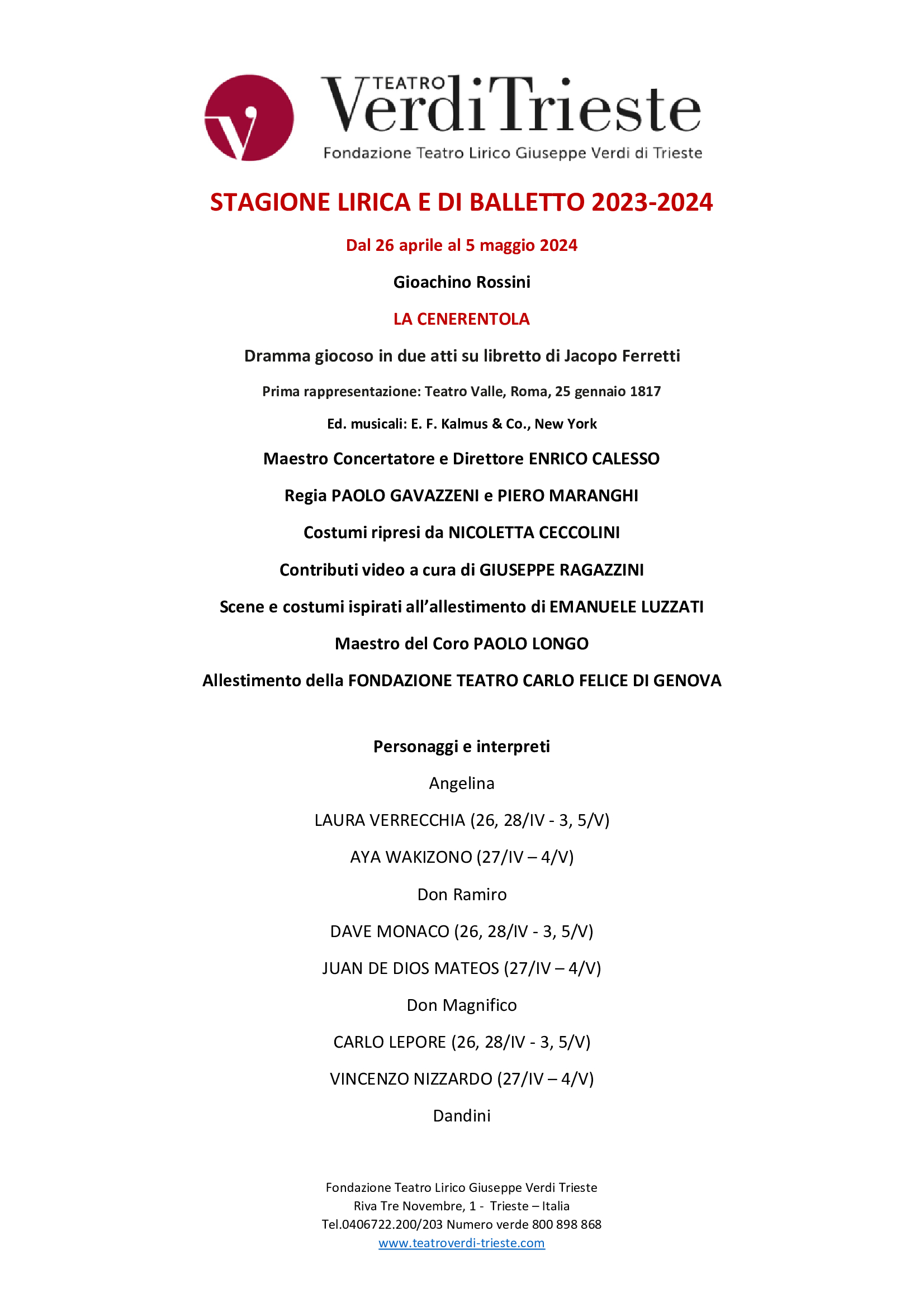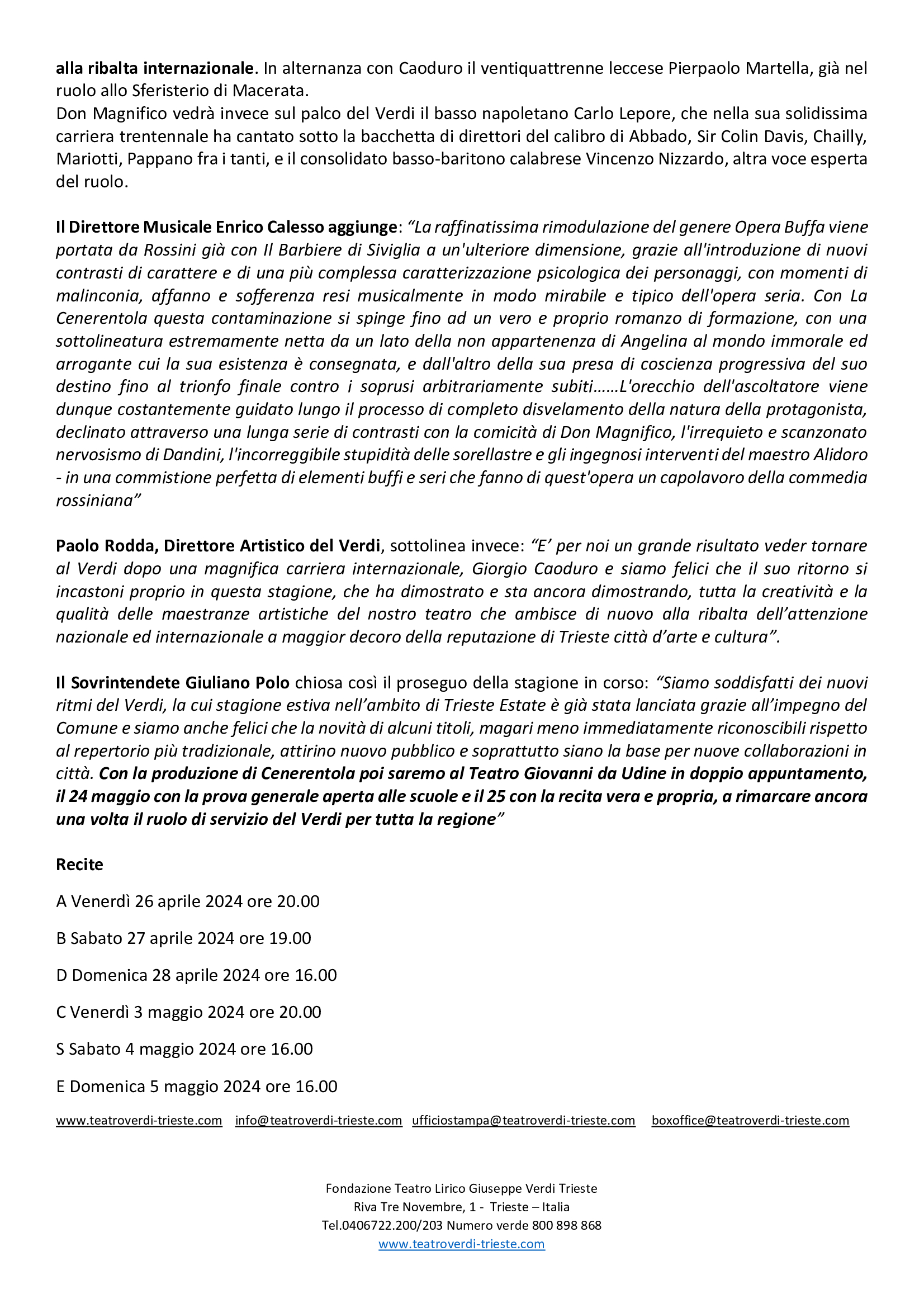 Il Sovrintendete Giuliano Polo chiosa così il proseguo della stagione in corso: “Siamo soddisfatti dei nuovi ritmi del Verdi, la cui stagione estiva nell’ambito di Trieste Estate è già stata lanciata grazie all’impegno del Comune e siamo anche felici che la novità di alcuni titoli, magari meno immediatamente riconoscibili rispetto al repertorio più tradizionale, attirino nuovo pubblico e soprattutto siano la base per nuove collaborazioni in città. Con la produzione di Cenerentola poi saremo al Teatro Giovanni da Udine in doppio appuntamento, il 24 maggio con la prova generale aperta alle scuole e il 25 con la recita vera e propria, a rimarcare ancora una volta il ruolo di servizio del Verdi per tutta la regione”