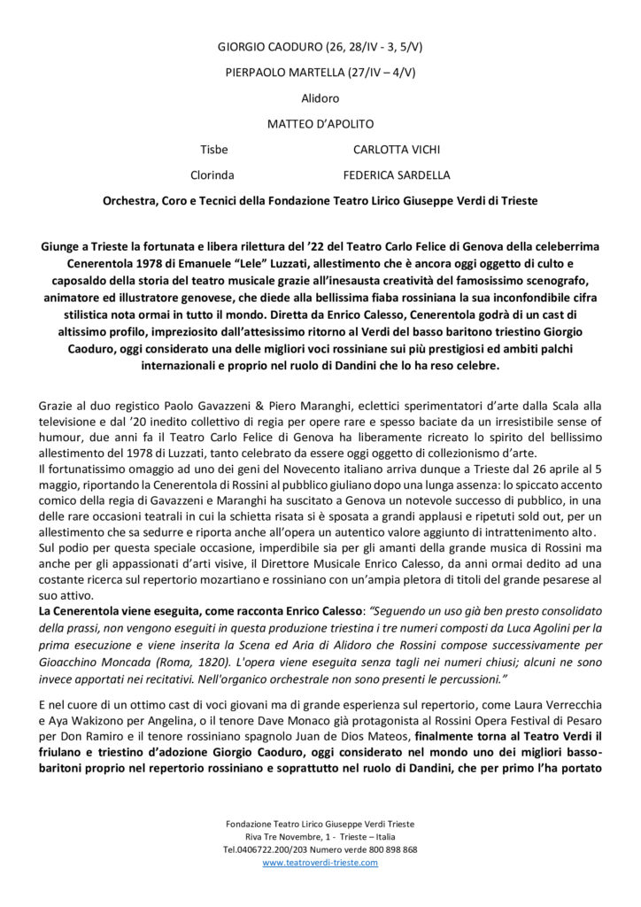 Il fortunatissimo omaggio ad uno dei geni del Novecento italiano arriva dunque a Trieste dal 26 aprile al 5 maggio, riportando la Cenerentola di Rossini al pubblico giuliano dopo una lunga assenza: lo spiccato accento comico della regia di Gavazzeni e Maranghi ha suscitato a Genova un notevole successo di pubblico, in una delle rare occasioni teatrali in cui la schietta risata si è sposata a grandi applausi e ripetuti sold out, per un allestimento che sa sedurre e riporta anche all’opera un autentico valore aggiunto di intrattenimento alto.