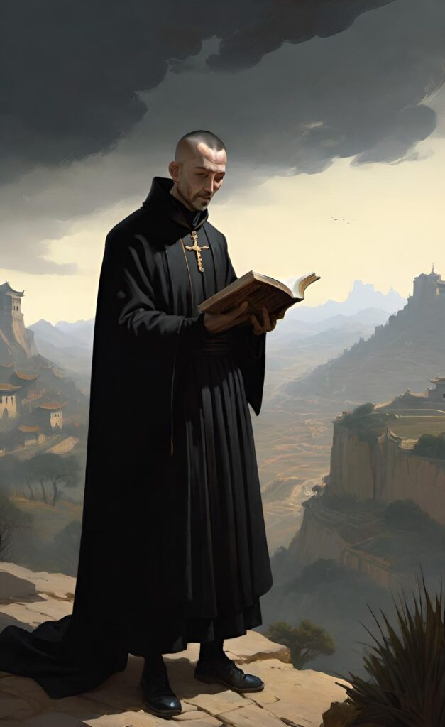 El hombre de negro es celoso, apasionado. Ha llegado hace años desde Italia a esta tierra ignota de Catay en procura de encontrarse a sí mismo a través de su vocación religiosa. Llevar la palabra de Dios, que es Uno y Tres, es el deber de todo creyente y sobre todo de la Compañía de Jesús que se ha aventurado a territorios inalcanzables: la India, Brasil, Cipango.