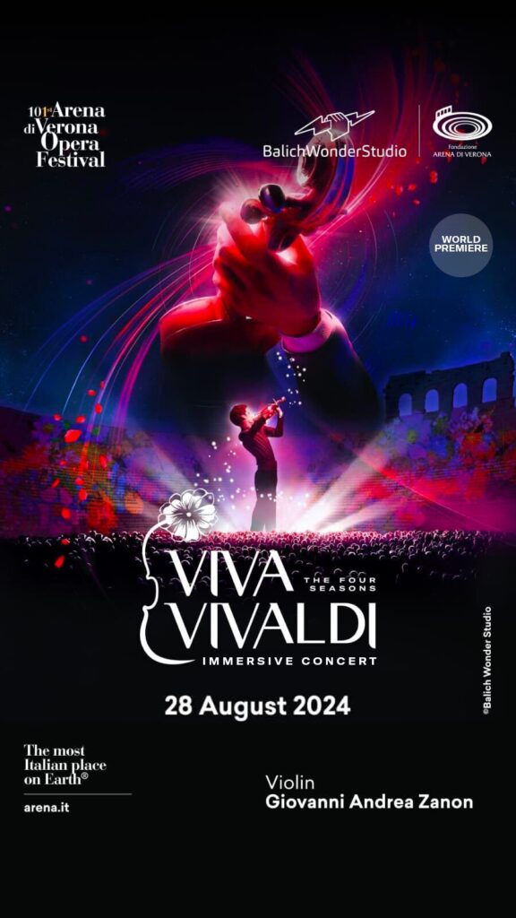 Inoltre, in anteprima mondiale, Fondazione Arena di Verona e Balich Wonder Studio presentano un grande concerto immersivo con proiezioni tridimensionali per celebrare Le quattro stagioni, in occasione dei 300 anni dalla pubblicazione del capolavoro di Antonio Vivaldi. Viva Vivaldi. The four seasons immersive concert è in programma il 28 agosto con l’Orchestra dell’Arena di Verona e il violinista Giovanni Andrea Zanon, nel progetto visionario e multisensoriale del creative director Marco Balich. Un approccio completamente nuovo alla scenografia, attraverso la tecnologia, per avvicinare un pubblico sempre più giovane all’Opera Festival.