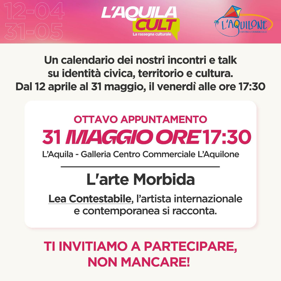 L’Aquila, 30 maggio 2024 – A chiudere l’ottavo e ultimo evento di questo primo ciclo della riuscitissima rassegna culturale “L’Aquila Cult” del Centro Commerciale L’Aquilone, sarà l’artista Lea Contestabile con “L’Arte Morbida”.