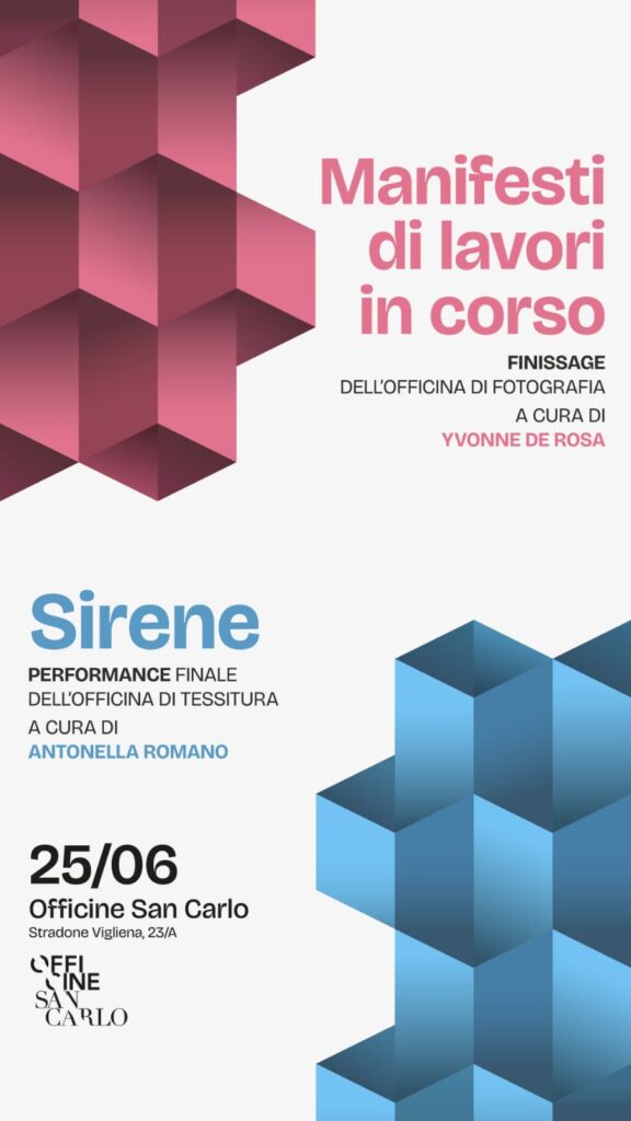Trovano spazio comune, a Officine San Carlo, i lavori conclusivi di due progetti che hanno interessato i Laboratori Artistici di Vigliena: Sirene, con la performancefinale dell’Officina di Tessitura a cura di Antonella Romano, e Manifesti di Lavori in Corso, il finissage dell’Officina di Fotografia a cura di Yvonne De Rosa.