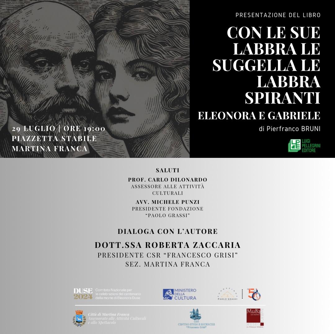 Ma già nel libro ci sono diversi elementi che si proiettono oltre la tematica della loro relazione. Un viaggio dentro l’amore e per l’amore dentro le arti. Pierfranco Bruni ha scritto diversi testi sia su d’Annunzio che sulla Duse. Direttore scientifico del Progetto Undulna Duse e Responsabile Comunicazione del Comitato Nazionale Centenario Duse. Martina Franca dunque apre le porte alle celebrazioni dusiane e lo fa in grande stile nel corso del Festival della Valle D’Itria. 50 edizioni.