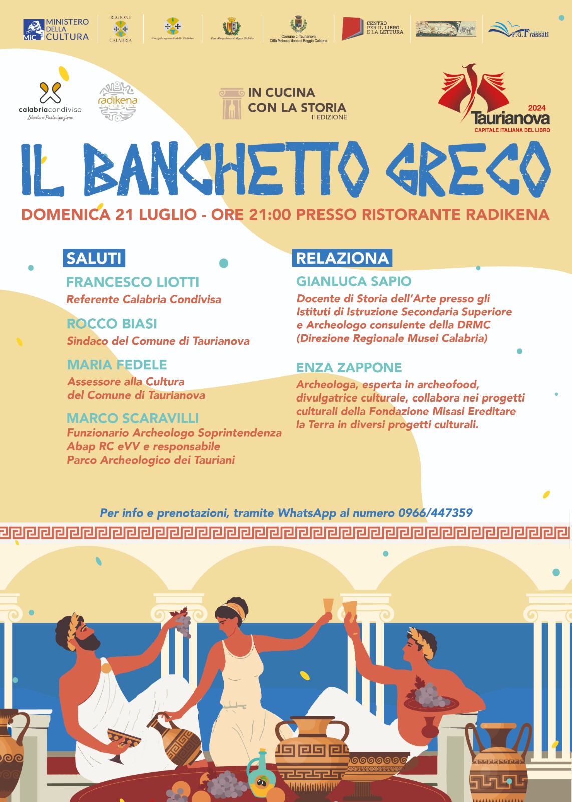 Per riscoprire e valorizzare questi legami, Taurianova Capitale del Libro ospiterà – domenica 21 luglio alle 21.00 presso il ristorante Radikena – “Il banchetto greco” organizzato nell’ambito della seconda edizione di “In cucina con la storia”, un ciclo di incontri promosso dall’Associazione Calabria Condivisa in collaborazione con il Comune di Taurianova, ideato per riscoprire le radici della nostra cultura attraverso la degustazione di piatti tipici della tradizione culinaria dell’Antica Grecia.