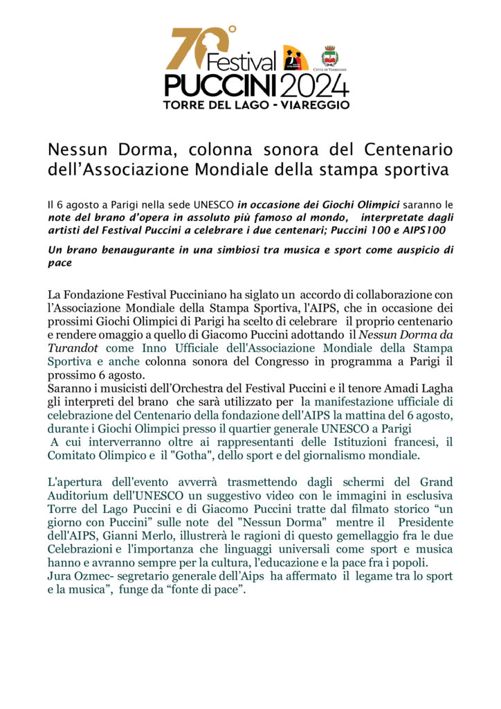La Fondazione Festival Pucciniano ha siglato un accordo di collaborazione con l’Associazione Mondiale della Stampa Sportiva, l’AIPS, che in occasione dei prossimi Giochi Olimpici di Parigi ha scelto di celebrare il proprio centenario e rendere omaggio a quello di Giacomo Puccini adottando il Nessun Dorma da Turandot come Inno Ufficiale dell’Associazione Mondiale della Stampa Sportiva e anche colonna sonora del Congresso in programma a Parigi il prossimo 6 agosto.