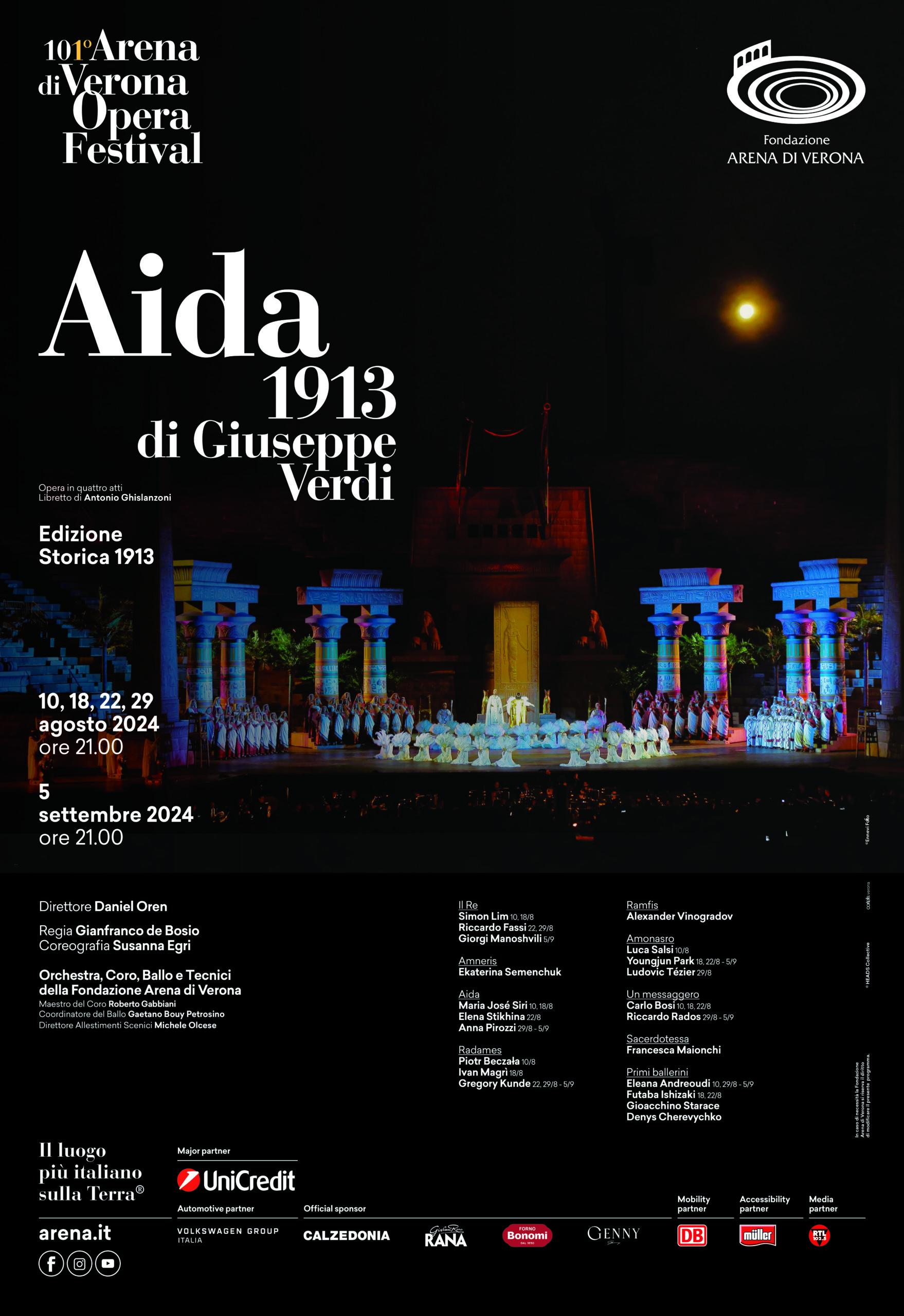 Il 10 agosto, per la prima di cinque rappresentazioni, rivivrà la magia della prima notte d’opera in Arena: era infatti il 10 agosto 1913 quando le note del capolavoro di Verdi riecheggiarono per la prima volta fra le pietre del millenario anfiteatro. L’allestimento che torna in scena è quello che nel 1982 volle Gianfranco de Bosio, regista, docente e per due volte Sovrintendente dell’allora Ente Lirico. Con un’operazione pioneristica di ricostruzione storica, partendo dai bozzetti dell’architetto Ettore Fagiuoli e dalle poche foto d’epoca, creò una nuova tradizione, non solo un omaggio al 1913 ma un dialogo continuo e costruttivo con gli interpreti di oggi.