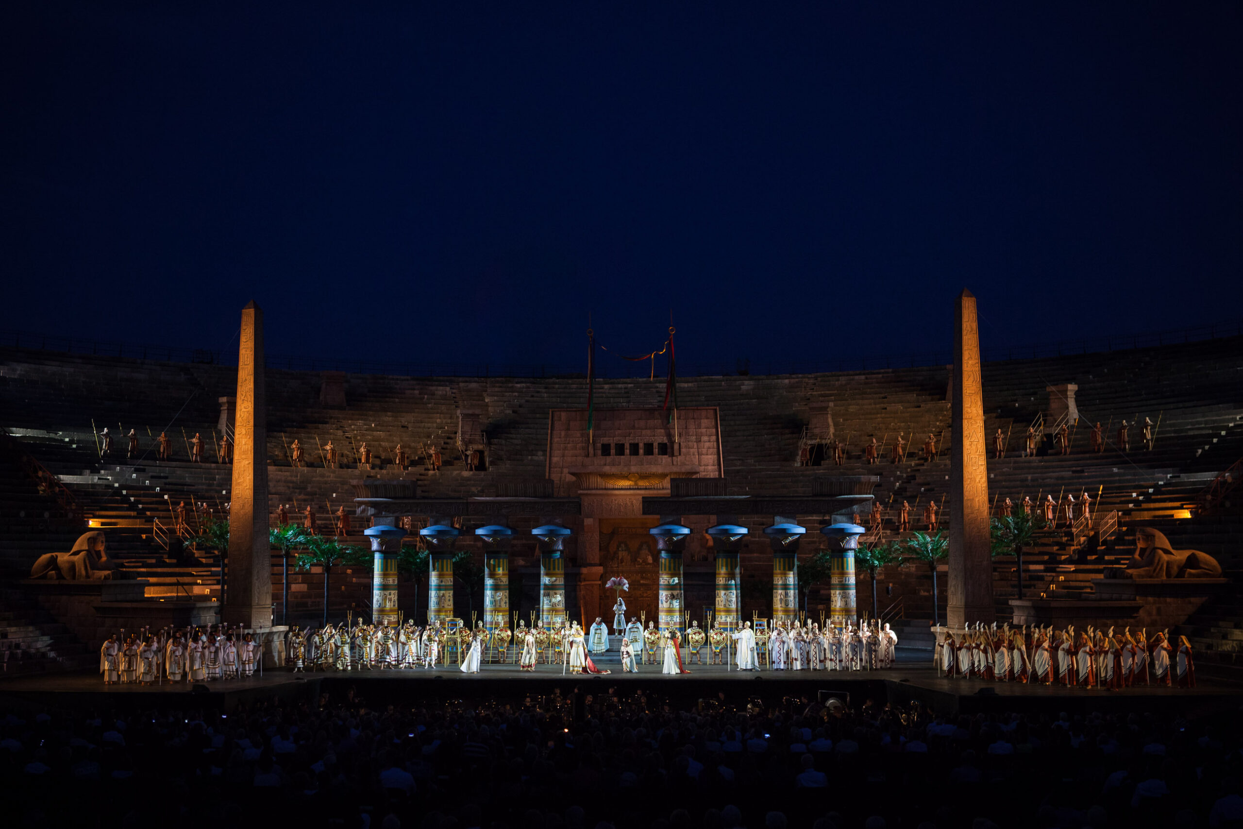 A 111 anni esatti dalla prima Aida in Arena, il classico allestimento vuole omaggiare il suo ideatore, Gianfranco de Bosio, che la riscoprì nel 1982