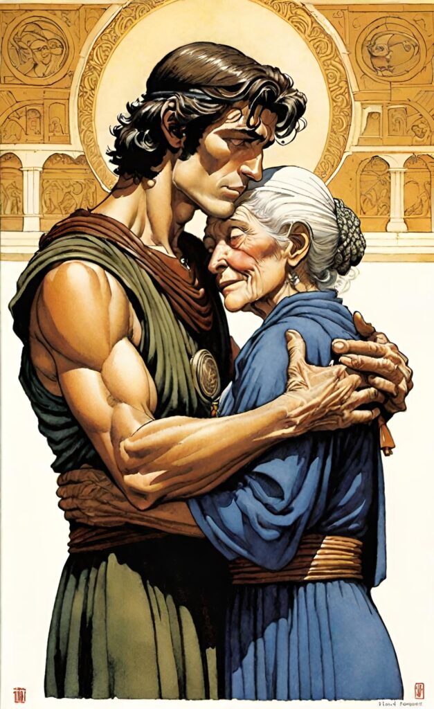 Lars Porsena se acerca y le acaricia los cabellos canos con una ternura viril. Es el saludo de un guerrero a otro. Acerca los labios al oído y dice algo.