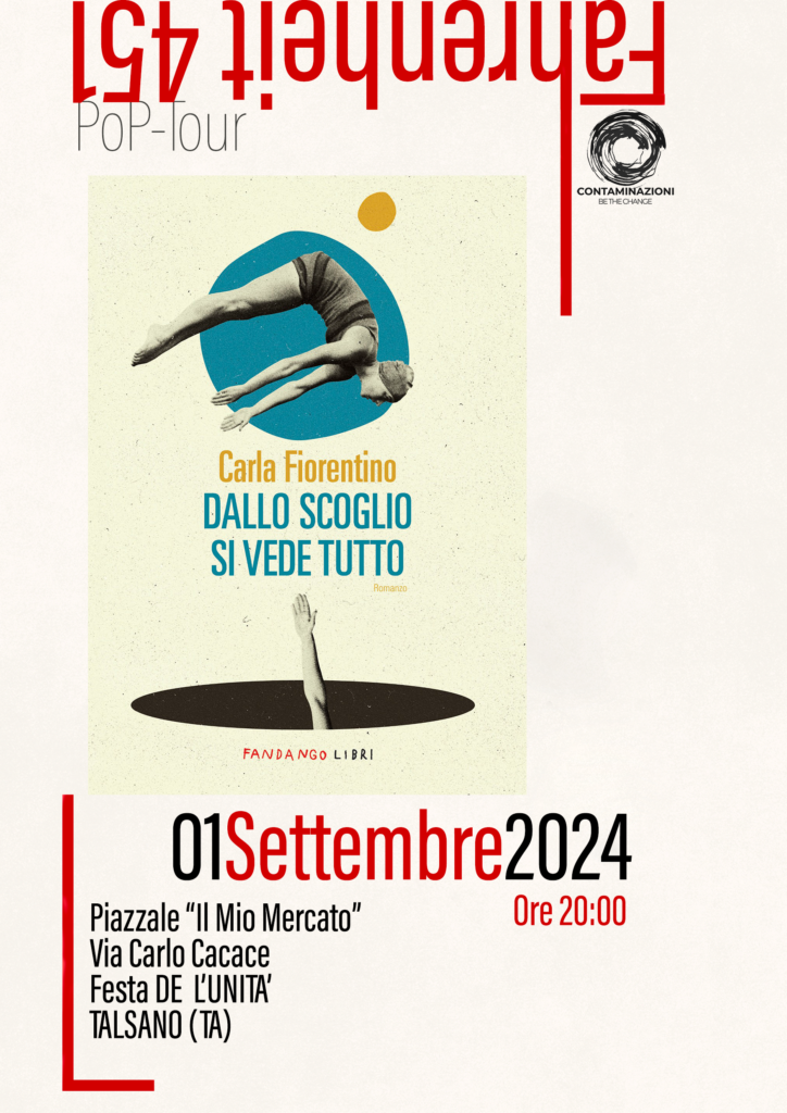 Domenica 1 settembre alle ore 20, in via Cacace presso «Il Mio Mercato» a Talsano, Taranto, la scrittrice cagliaritana Carla Fiorentino presenterà il suo ultimo romanzo «Dallo scoglio si vede tutto» (Fandango), all’interno della rassegna letteraria «Fahrenheit 451 – Pop-Tour», ideata dall’associazione Contaminazioni. Questo evento si svolge in collaborazione con la Festa de L’Unità Pd Talsano.