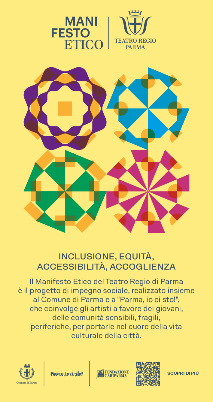 Il Manifesto etico, realizzato dal Teatro Regio di Parma insieme al Comune di Parma, all’associazione “Parma, io ci sto!” e a Fondazione Cariparma è il progetto di impegno sociale proposto agli artisti del Festival Verdi, di Verdi Off e della Stagione Lirica che vede il Teatro Regio riconoscere e strutturare, in una proposta ampia e articolata, la necessità di andare oltre la propria missione, particolarmente in questi tempi, per abbracciare i giovani, le comunità più sensibili, fragili e periferiche, per coinvolgerle e farle sentire al centro, nel cuore della vita culturale della città..