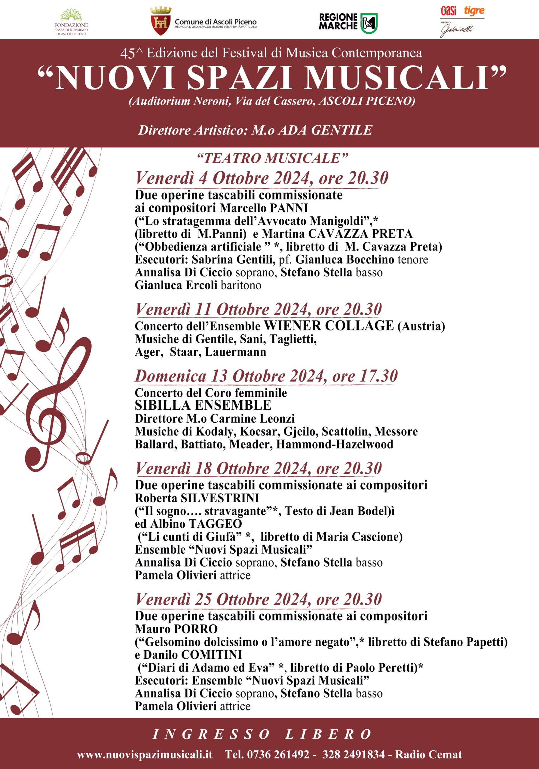 ASCOLI PICENO – Il Festival “Nuovi Spazi Musicali”, giunto ormai alla sua 45^ edizione sotto la guida della compositrice ADA GENTILE, prende il via il 4 ottobre ad Ascoli Piceno, all’Auditorium Neroni. Si articolerà in 5 concerti di cui 3 dedicati alle “operine tascabili” divenute ormai la caratteristica del Festival che intende con esse far rivivere il genere dell’opera buffa tanto caro al grande compositore marchigiano Gioacchino Rossini.