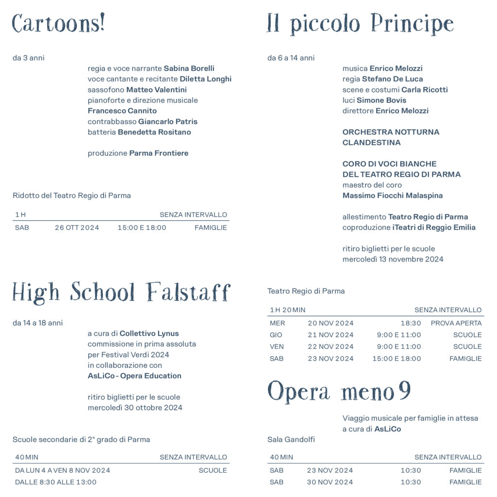 12 titoli, oltre 20 appuntamenti per famiglie, scuole, bambini e ragazzi da 0 a 14 anni. Il piccolo Principe l’opera di Enrico Melozzi per i più piccoli, gli spettacoli di AsLiCo – Opera Education ispirati a Falstaff, Due della Compagnia Rodisio, Fortissime! di Valentina Scheldhoven Ciardelli e Anna Artesano sono le novità di Regio Young che torna con i suoi format più amati: Cartoons!,