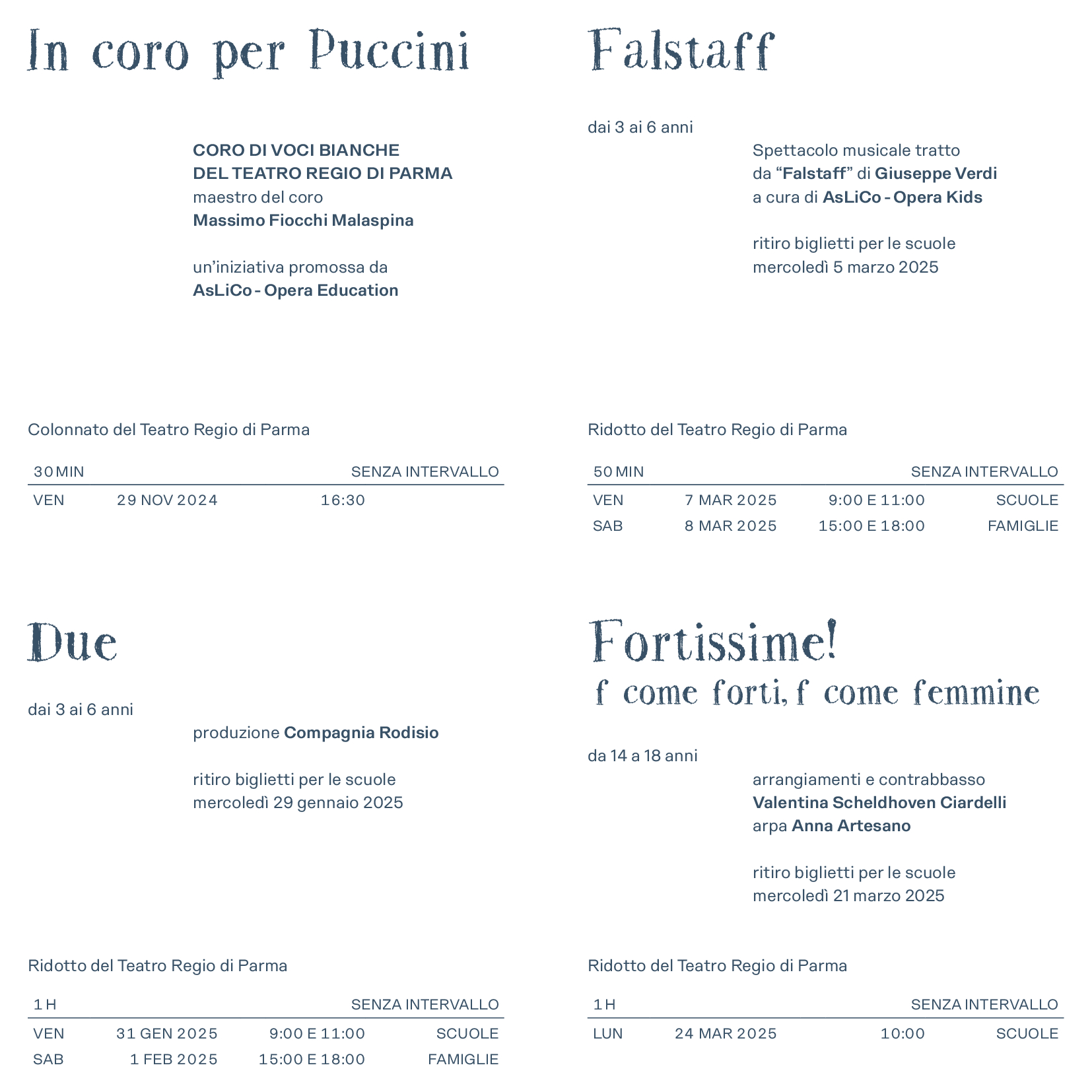 Lunedì 24 marzo 2025 ore 10.00 al Ridotto del Teatro Regio di Parma per le scuole va in scena Fortissime! f come forti, f come femmine per ragazzi da 14 a 18 anni, con Valentina Scheldhoven Ciardelli (arrangiamenti e contrabbasso) e Anna Artesano (arpa): un duo peculiare che condurrà i giovani spettatori in un viaggio in musica alla scoperta delle protagoniste delle opere di Giacomo Puccini, per riflettere sugli stereotipi di genere e su alcuni tratti universali della condizione femminile, catturati dal compositore e sublimati nella sua opera immortale.