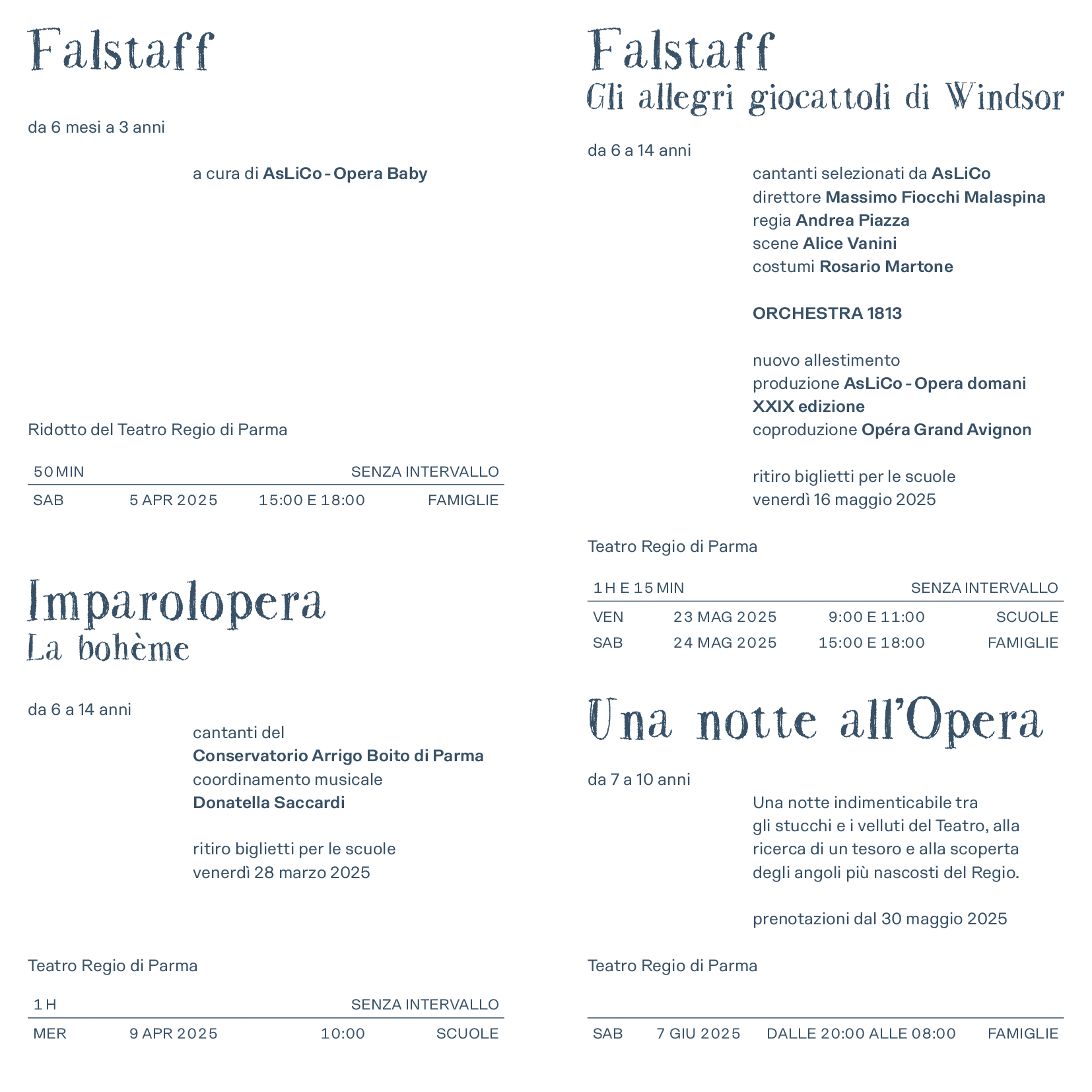 Sono dedicati all’ultimo capolavoro verdiano gli spettacoli di AsLiCo-Opera Education, al Ridotto del Teatro Regio di Parma. Falstaff, burattini e burle, spettacolo partecipativo AsLiCo-Opera Kids rivolto ai bambini da 3 a 6 anni, andrà in scena al Ridotto del Teatro Regio di Parma venerdì 7 marzo 2025, ore 9.00 e ore 11.00 per le scuole e sabato 8 marzo 2025 ore 15.00 e ore 18.00 per le famiglie. Falstaff Opera Baby per i bambini da 6 mesi a 3 anni e le loro famiglie va in scena sabato 5 aprile 2025 ore 15.00 e 18.00.
