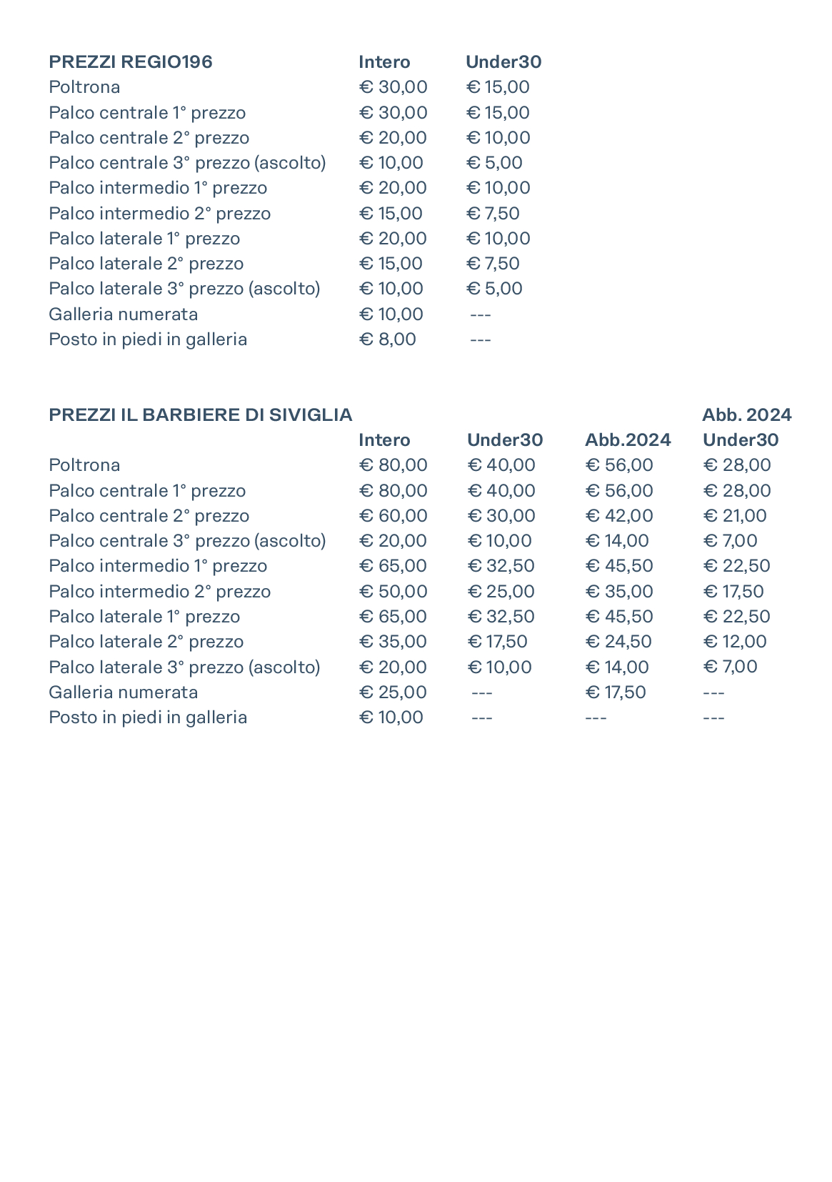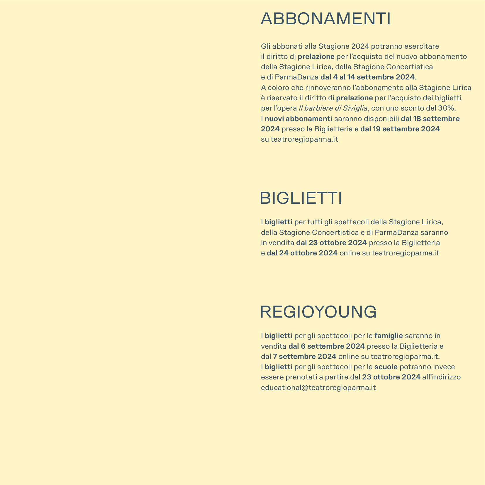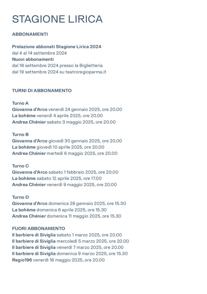 I nuovi abbonamenti saranno disponibili dal 18 settembre 2024 presso la Biglietteria e dal 19 settembre 2024 su teatroregioparma.it.
