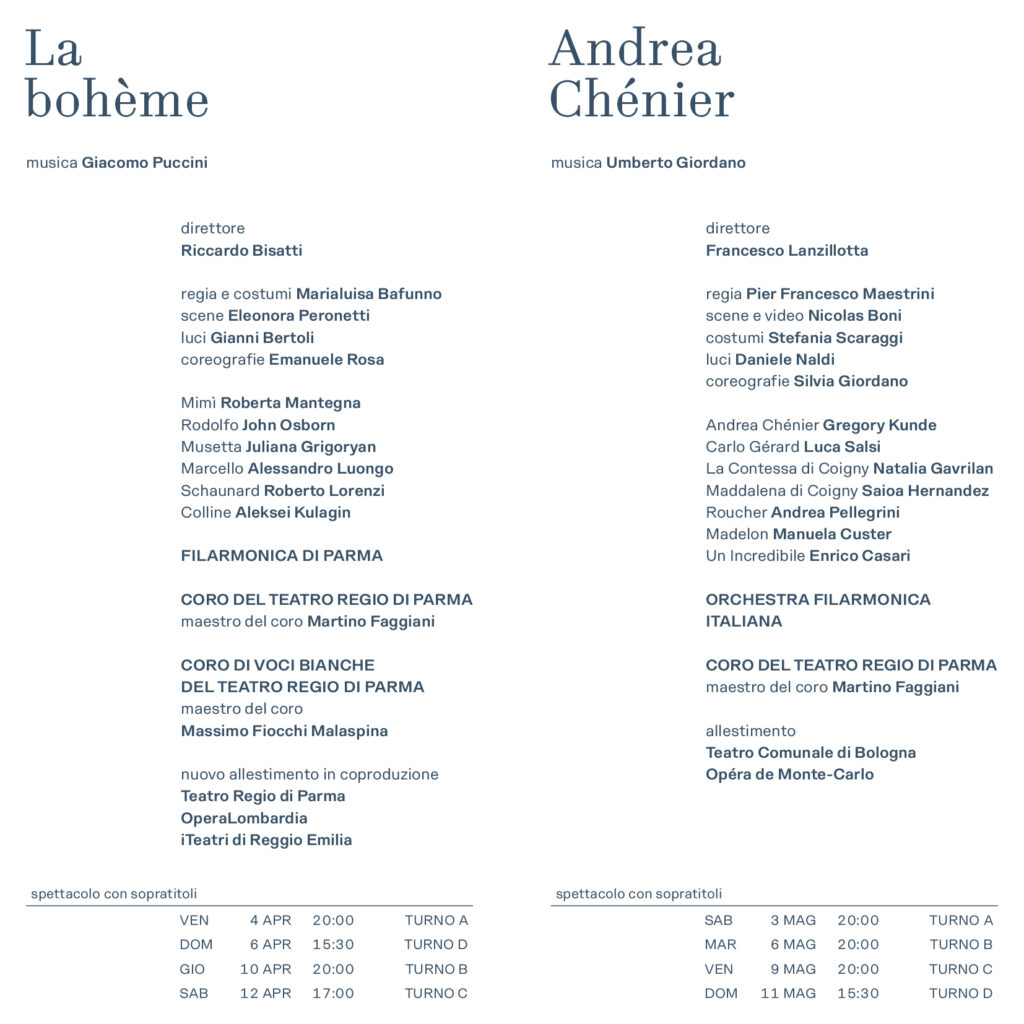 La Stagione Lirica si conclude con Andrea Chénier, dramma storico in quattro quadri di Umberto Giordano su libretto di Luigi Illica, sabato 3 maggio ore 20.00 (recite martedì 6, venerdì 9 maggio ore 20.00, domenica 11 maggio ore 15.30) nell’allestimento del Teatro Comunale di Bologna e dell’Opéra de Monte-Carlo con la regia di Pier Francesco Maestrini, scene e video di Nicolas Boni,costumi Stefania Scaraggi,luci Daniele Naldi,coreografie Silvia Giordano. Francesco Lanzillotta dirige l’Orchestra Filarmonica Italiana e il Coro del Teatro Regio di Parma, maestro del coro Martino Faggiani. In scena Gregory Kunde (Andrea Chénier), Luca Salsi (Carlo Gérard), Natalia Gavrilan (La Contessa di Coigny), Saioa Hernandez (Maddalena di Coigny), Andrea Pellegrini (Roucher), Manuela Custer (Madelon, per la prima volta al Regio), Enrico Casari (Un Incredibile, per la prima volta al Regio).