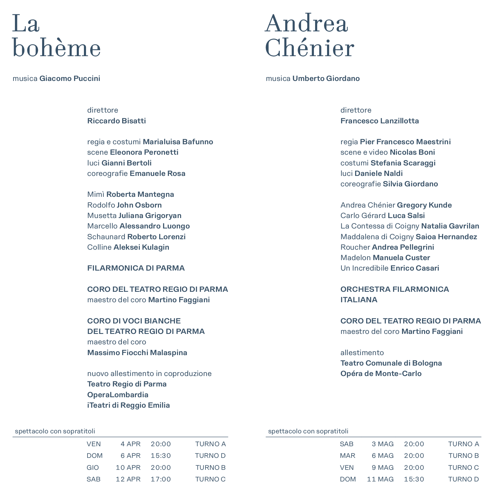 preparato da Martino Faggiani, e del Coro di Voci Bianche del Teatro Regio di Parma, preparato da Massimo Fiocchi Malaspina.