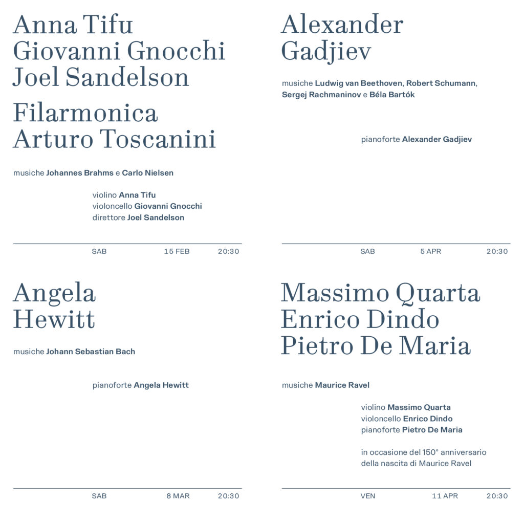 La Stagione prosegue con due virtuosi della tastiera: la canadese Angela Hewitt, tra le maggiori interpreti bachiane, sabato 8 marzo ore 20.30 eseguirà le Variazioni Goldberg di Johann Sebastian Bach. Sabato 5 aprile ore 20.30 Alexander Gadjiev, primo italiano dopo Maurizio Pollini a salire sul podio del Concorso Chopin, interpreta la Sonata n. 12 op. 26 e le Bagatelle op.126 nn. 1, 2, 4, 6 di Ludwig van Beethoven, All’aria aperta di Béla Bartók, Gesänge der Frühe op. 13 di Robert Schumann e la Sonata n.2 di Sergej Rachmaninov.